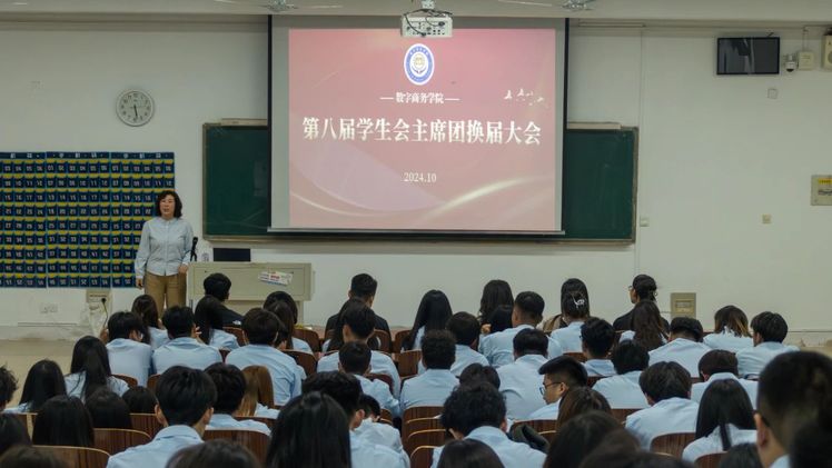 ??10月10日下午,數(shù)字商務(wù)學(xué)院在階梯三教室隆重舉辦了第八屆學(xué)生會主席團(tuán)換屆大會。此次會議由數(shù)字商務(wù)學(xué)院黨總支副書記欒秋平、團(tuán)總支書記賈子龍以及全體輔導(dǎo)員、學(xué)生代表等參加本次大會。