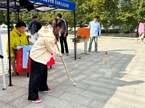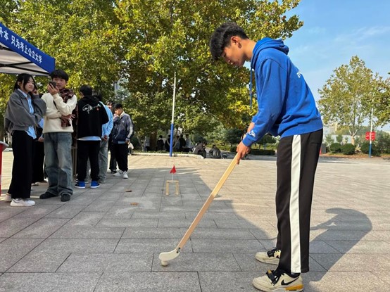 ??活動(dòng)現(xiàn)場(chǎng),漆畫、書法攤位前,同學(xué)們則沉浸在創(chuàng)作的樂趣中,感受傳統(tǒng)文化的博大精深。投壺、投沙包等傳統(tǒng)游戲項(xiàng)目同樣備受青睞,同學(xué)們?cè)谳p松愉快的氛圍中挑戰(zhàn)自我,體驗(yàn)傳統(tǒng)文化的樂趣。武術(shù)表演更是將現(xiàn)場(chǎng)氣氛推向高潮,同學(xué)們?cè)谖湔叩膸ьI(lǐng)下,一同感受中國(guó)武術(shù)的獨(dú)特魅力。此外,捶丸這一古代體育項(xiàng)目也吸引了眾多愛好者的參與,大家紛紛嘗試用木杖擊打小球,體驗(yàn)古代的娛樂方式。
