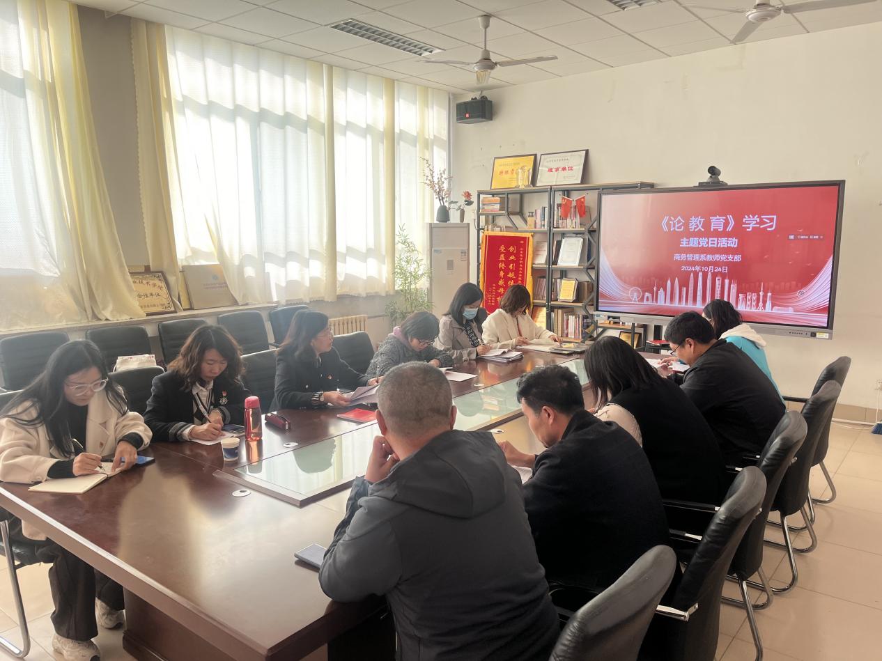 2024 年 10 月 24 日,商務(wù)管理系教師黨支部舉行“學(xué)習(xí)《論教育》,勇?lián)毥绦率姑敝黝}黨日活動(dòng),本次活動(dòng)以學(xué)習(xí)習(xí)近平總書記關(guān)于教育的重要專題文集 ——《論教育》為主題,意義重大,活動(dòng)過程先學(xué)后議,邊學(xué)邊議,形成“學(xué)、思、悟、踐”的濃郁氛圍,為商務(wù)管理系的教育工作注入了新的活力與動(dòng)力。會(huì)議由教師黨支部書記周雪莉主持。