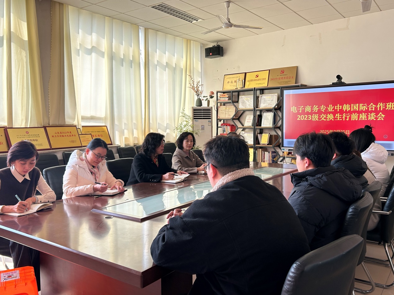 2月25日下午,我校電子商務(wù)專業(yè)2023級中韓國際合作班赴韓國培材大學(xué)交換生行前培訓(xùn)會在綜合樓408會議室召開,我校國際交流與合作部主任董紅、商務(wù)管理系李敏等人參加會議,會議由李敏主持。
