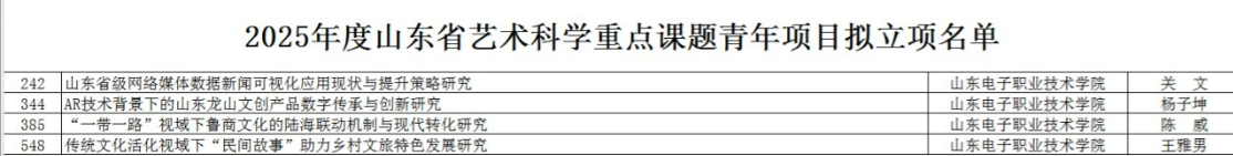 山東省藝術(shù)科學(xué)重點(diǎn)課題旨在推動藝術(shù)科學(xué)領(lǐng)域的理論創(chuàng)新與實(shí)踐探索,重點(diǎn)支持具有前瞻性、戰(zhàn)略性和現(xiàn)實(shí)意義的研究項(xiàng)目,競爭激烈。兩項(xiàng)青年項(xiàng)目的成功立項(xiàng),不僅是對王雅男博士、陳威兩位青年學(xué)者研究能力與選題價(jià)值的高度認(rèn)可,也充分體現(xiàn)了商務(wù)管理系在跨學(xué)科研究、服務(wù)地方文化經(jīng)濟(jì)發(fā)展方面的前瞻布局和扎實(shí)積累。
