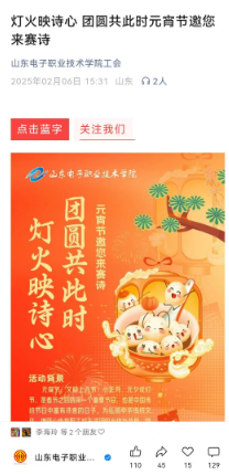 當(dāng)數(shù)字科技邂逅千年詩韻,會碰撞出怎樣的文化火花?元宵節(jié)期間,燈火映詩心 團(tuán)圓共此時主題賽詩活動在學(xué)校新媒體平臺火熱開展,通過云端賽詩會的創(chuàng)新形式,讓傳統(tǒng)文化煥發(fā)時代光彩,在教職工群體中掀起以詩會友慶團(tuán)圓的文化熱潮。