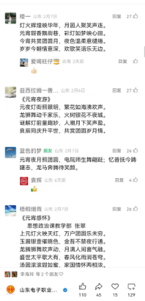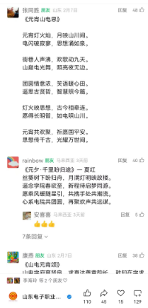 作為活動承辦方,商務(wù)管理系分工會巧借新媒體傳播優(yōu)勢,依托學(xué)校工會微信公眾號搭建云端詩社,創(chuàng)新設(shè)置了“即興創(chuàng)作+互動點贊”的數(shù)字化參與模式。教職工們熱情高漲,或即興揮毫創(chuàng)作原創(chuàng)詩詞,或化身當(dāng)代推敲客字斟句酌,將家國情懷、教育理想、佳節(jié)愿景融入平仄韻律。據(jù)統(tǒng)計,活動期間累計收到詩詞作品120余首,留言區(qū)互動量達(dá)上千人次,精選作品單篇最高獲贊達(dá)127次。這場別開生面的“云端詩會”實現(xiàn)三重文化效應(yīng):一是以“賽”促創(chuàng),激發(fā)了教職工對詩詞的熱愛和創(chuàng)作熱情;二是以“云’為媒,構(gòu)建了傳統(tǒng)文化傳承新場景;三是以“情”聚力,通過共賞詩韻增強(qiáng)集體認(rèn)同。正如參賽教師所言:在平仄對仗中觸摸文化基因,于互動點贊間感受同事情誼,這個元宵節(jié)過得格外風(fēng)雅。