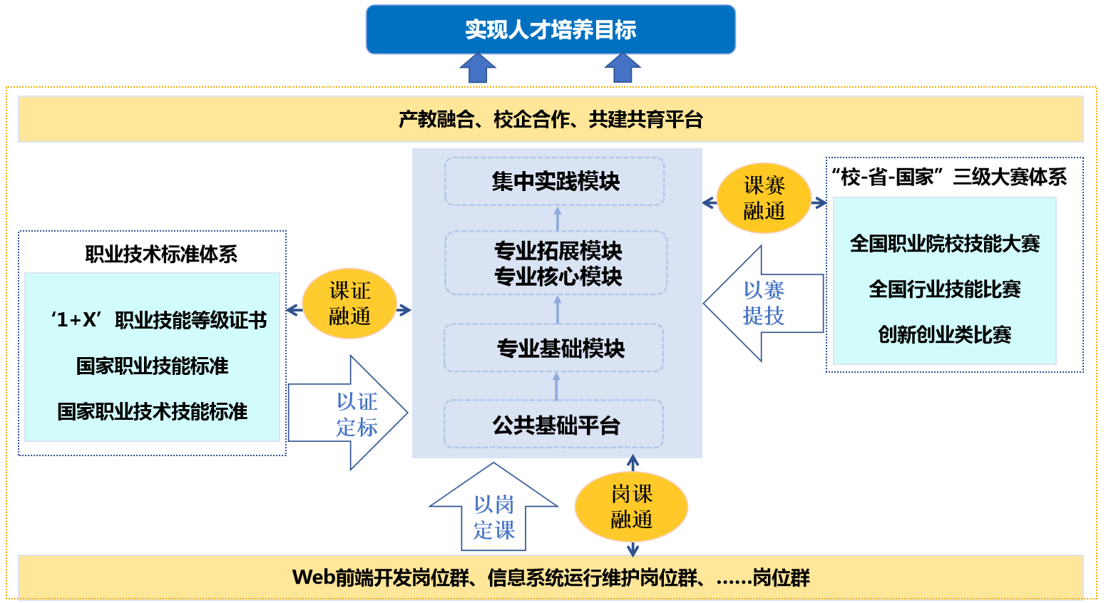 以培養(yǎng)學(xué)生工程實踐能力和創(chuàng)新創(chuàng)業(yè)能力為核心,通過專業(yè)教學(xué)、課內(nèi)課外實踐、X證書、技能競賽等活動,將思政教育和專業(yè)教育全面融合、理論教學(xué)與實踐教學(xué)深度融合、課程和職業(yè)資格證書、技能大賽融通。以校企合作為途徑,以服務(wù)就業(yè)為導(dǎo)向,以培養(yǎng)職業(yè)能力為主線,崗課賽證四位一體強技培德,培養(yǎng)出高素質(zhì)的計算機應(yīng)用技能人才。一體化育人模式如下圖所示。