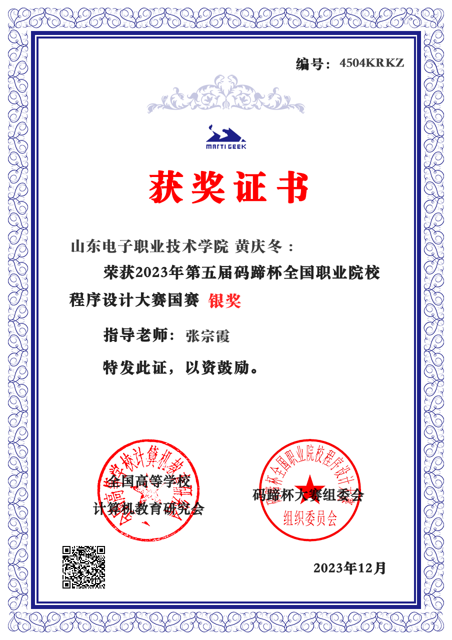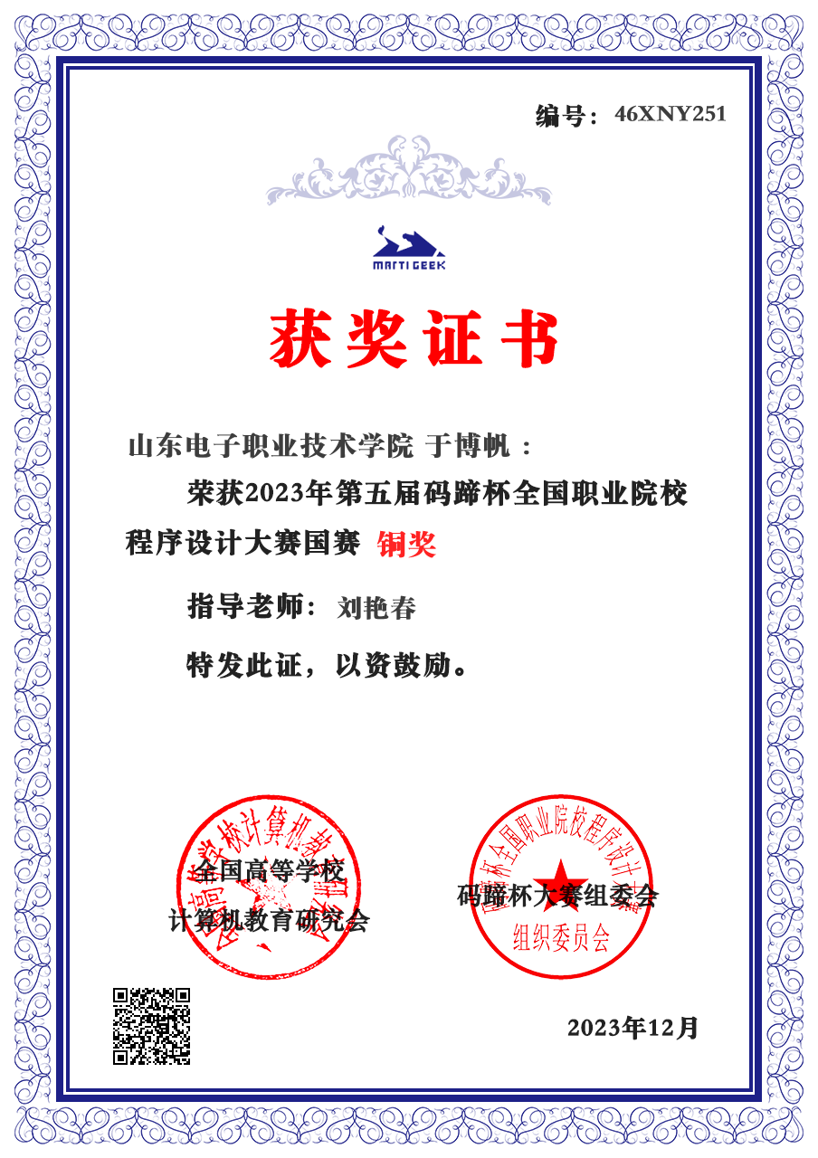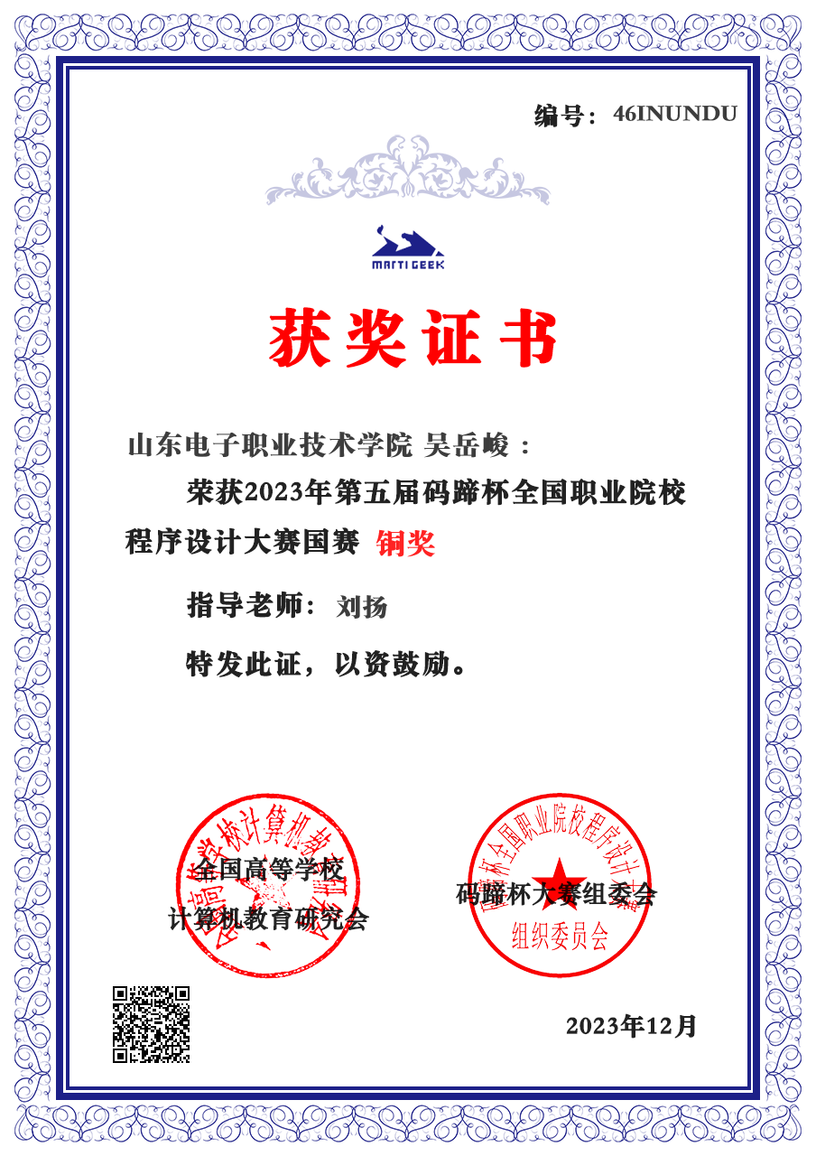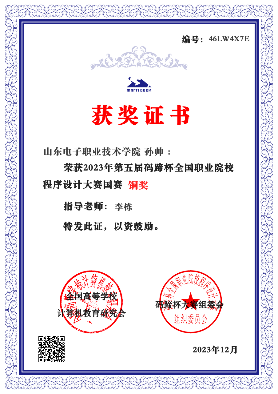 本專業(yè)堅持以學(xué)生為中心,注重學(xué)生個性化化培養(yǎng),技能大賽成績突出,獲全國職業(yè)院校技能大賽一等獎5項,二等獎2項;全省職業(yè)院校技能大賽一等獎2項,二等獎若干,全國行業(yè)技能大賽一等獎2項;2023全國碼蹄杯程序設(shè)計大賽國賽二等獎1項,省賽一等獎1項,二等獎若干;山東省大學(xué)省軟件設(shè)計大賽二等獎以上若干。