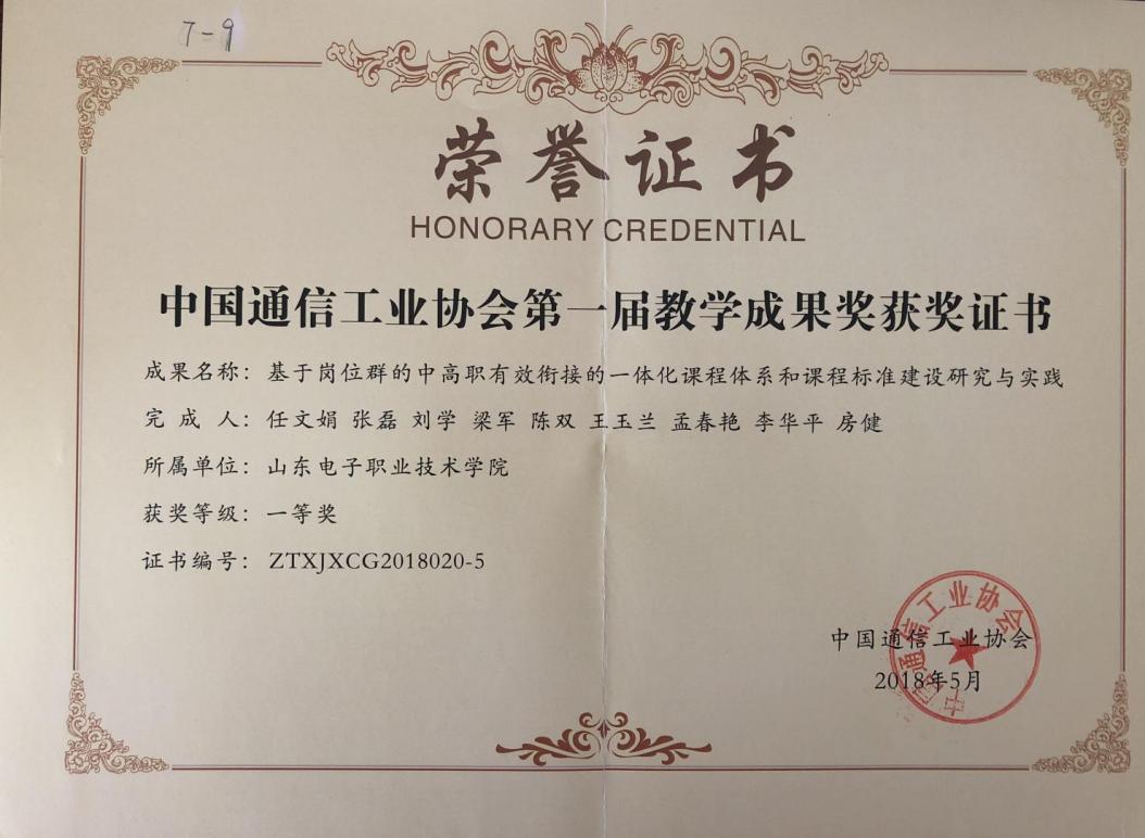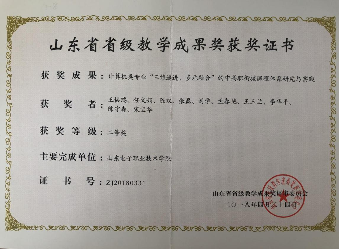 本專業(yè)致力于職業(yè)教育教學(xué)改革,依托省級以上教科研課題,榮獲山東省教學(xué)成果獎二等獎1項、中國通信工業(yè)協(xié)會教學(xué)成果獎一等獎1項、山東計算機學(xué)會成果獎一等獎1項。