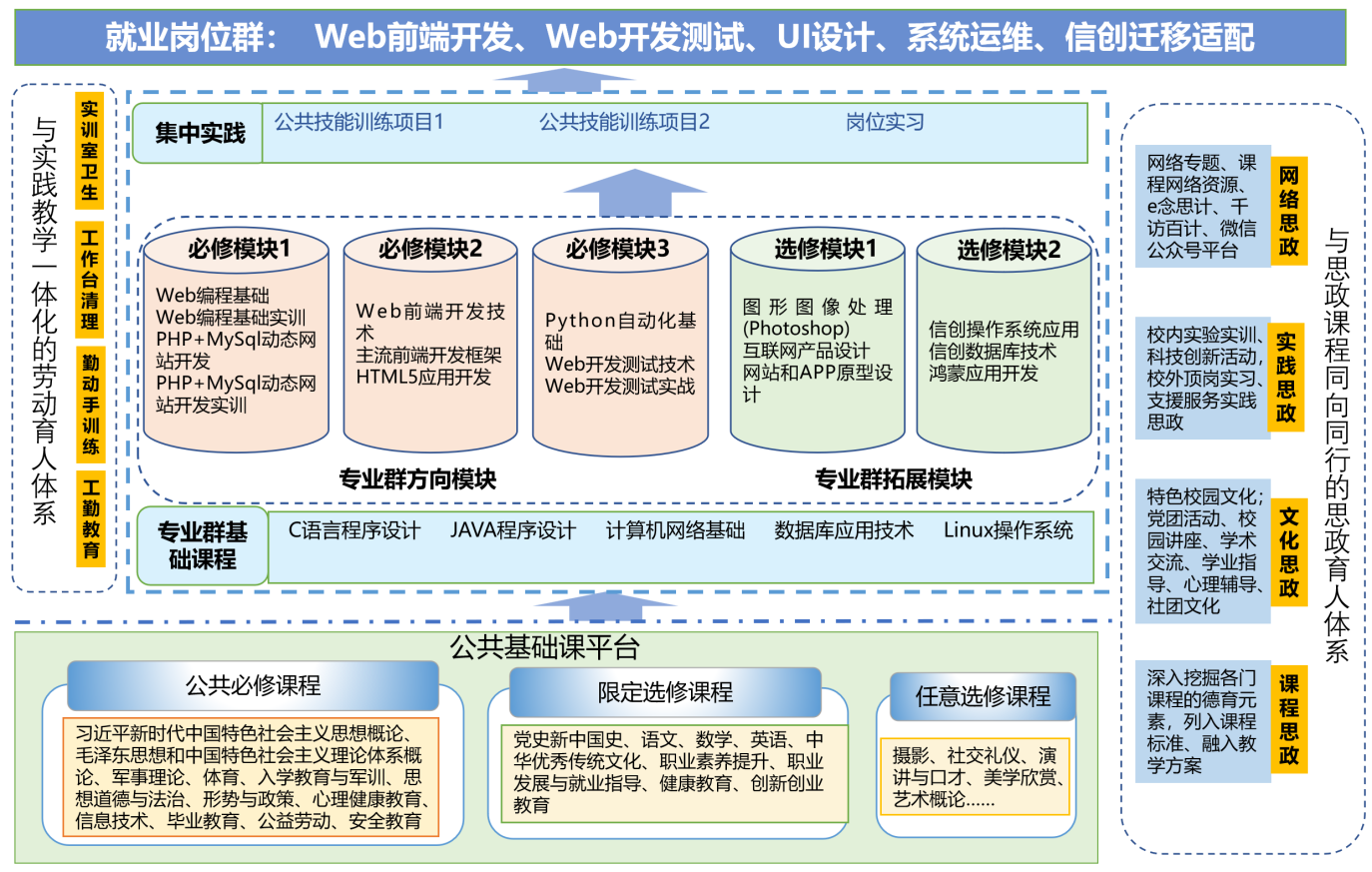 本專業(yè)群堅持立德樹人、德技并修,面向數(shù)字經(jīng)濟(jì)發(fā)展和網(wǎng)絡(luò)空間安全戰(zhàn)略,針對互聯(lián)網(wǎng)和相關(guān)服務(wù)、軟件和信息技術(shù)服務(wù)業(yè)、新一代信息技術(shù)產(chǎn)業(yè)等行業(yè)企業(yè),培養(yǎng)從事信息系統(tǒng)應(yīng)用與維護(hù)、Web前端設(shè)計與開發(fā)、信創(chuàng)適配與運維等工作,具備良好的人文素養(yǎng)、創(chuàng)新意識、勞動意識、精益求精的工匠精神等綜合素質(zhì),掌握扎實的專業(yè)基礎(chǔ)知識,具備較強的職業(yè)技能和可持續(xù)發(fā)展能力,德、智、體、美、勞全面發(fā)展的高素質(zhì)技術(shù)技能人才。