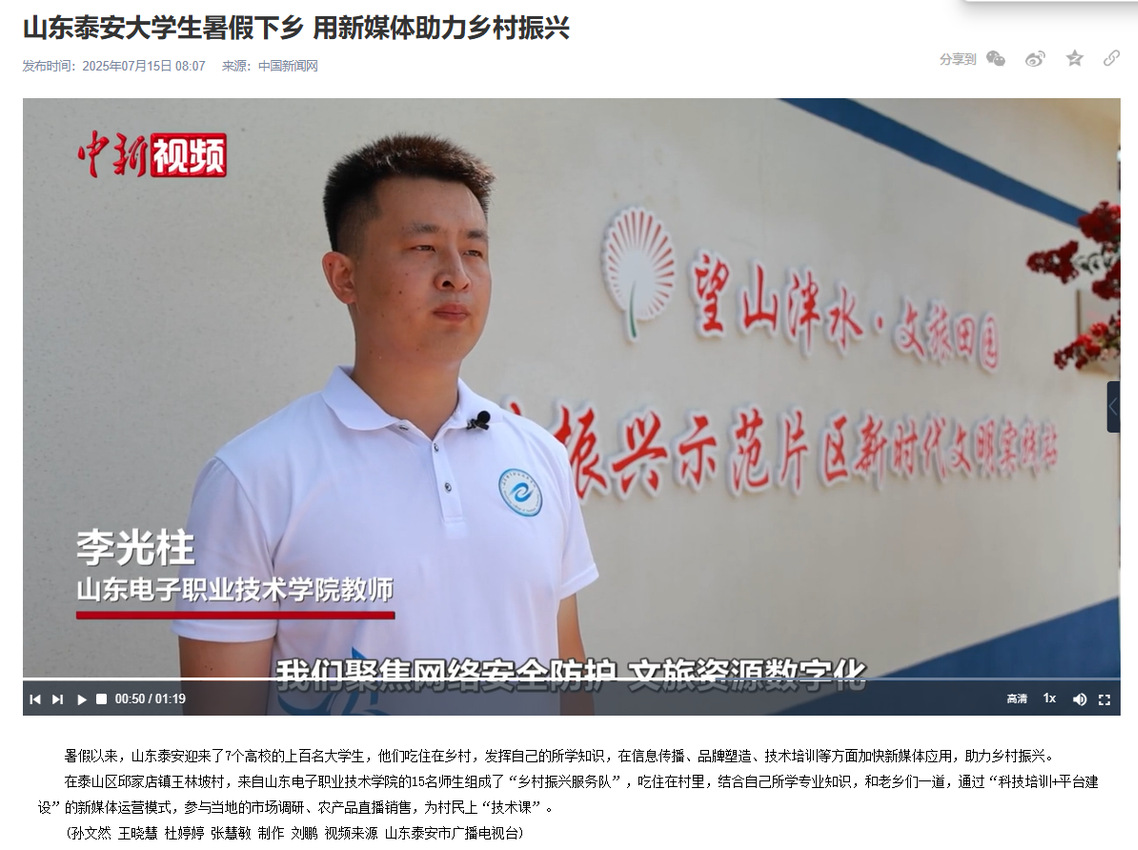 2025年7月,我院“e網(wǎng)情深”實(shí)踐團(tuán)赴泰安市泰山區(qū)邱家店鎮(zhèn)王林坡村開展了為期12天的暑期“三下鄉(xiāng)”社會實(shí)踐活動。活動得到泰山區(qū)電視臺、泰安日報(bào)、齊魯網(wǎng)、中國新聞網(wǎng)等12家媒體關(guān)注報(bào)道,成為展現(xiàn)當(dāng)代青年學(xué)子擔(dān)當(dāng)與風(fēng)采的生動縮影。