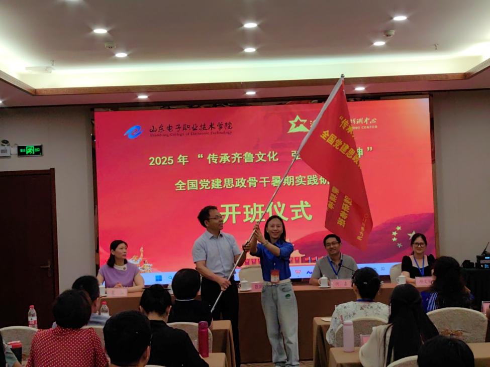 開班式上,山東電子職業(yè)技術(shù)學(xué)院思政部黨支部書記、院長張同勝介紹了本次研修班的基本情況并授班旗。他對全體學(xué)員的參會表示熱烈歡迎,希望大家認(rèn)真學(xué)習(xí)、學(xué)思踐悟、交流研討、學(xué)有所獲,在實踐研修中汲取奮進力量,在思想碰撞中提高思政本領(lǐng),在恪守規(guī)矩中提升自身素養(yǎng)。安徽農(nóng)業(yè)大學(xué)蔣兆雷教授作為學(xué)員代表發(fā)言,并作為研修班班長上臺接班旗。思政部副主任何嘉就研修班班級管理工作進行了布置和說明。