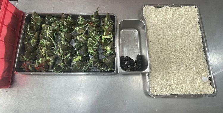 在包粽子環(huán)節(jié)中,師生分成若干小組,圍在桌子旁,開始動手實踐。只見大家手法嫻熟,有的折疊粽葉,有的填充糯米和餡料,有的則負(fù)責(zé)系緊粽子。現(xiàn)場氣氛熱烈而融洽,不時傳來陣陣歡聲笑語。在大家的共同努力下,一個個形狀各異、大小不一的粽子逐漸成形。