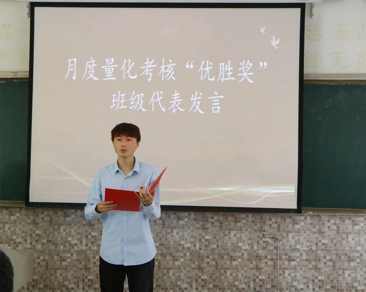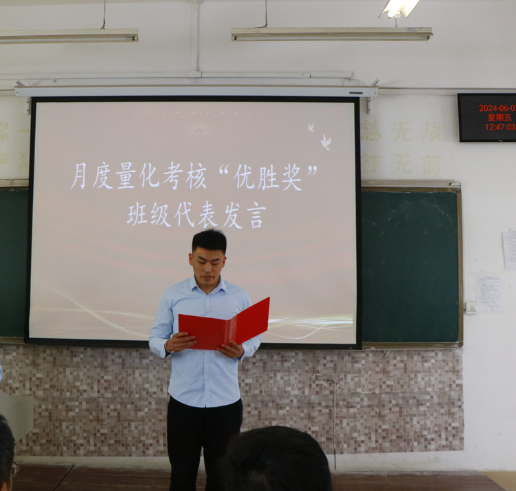 會(huì)議對(duì)學(xué)院4月和5月月度量化考核“優(yōu)勝班級(jí)”和“文明宿舍”進(jìn)行了表彰,為獲評(píng)月度“文明宿舍”的11個(gè)宿舍頒發(fā)流動(dòng)紅旗,為獲評(píng)月度“優(yōu)勝班級(jí)”的三個(gè)班級(jí)頒發(fā)獎(jiǎng)狀。文明宿舍代表S23201班姚鑫,優(yōu)勝班級(jí)代表S23011班劉鵬飛、S23014班杜磊相繼發(fā)言,先后介紹了文明宿舍創(chuàng)建和建設(shè)良好班集體的經(jīng)驗(yàn)做法。