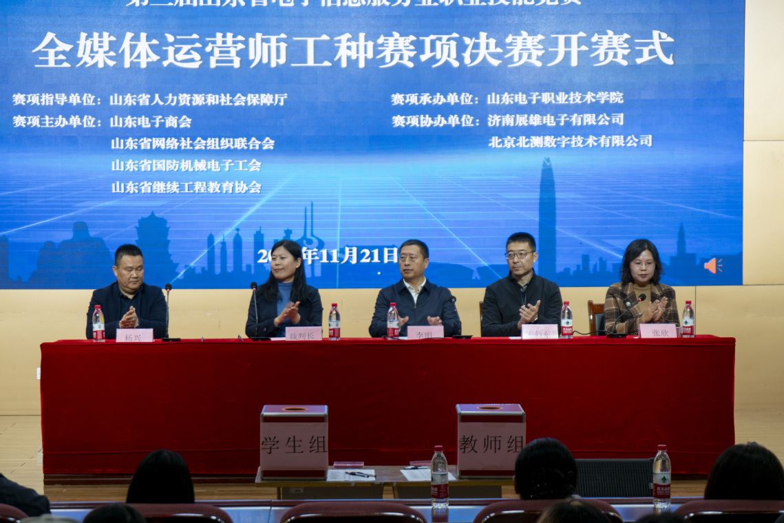 比賽由山東電子商會(huì)、山東省網(wǎng)絡(luò)社會(huì)組織聯(lián)合會(huì)、山東省發(fā)國防機(jī)械電子工會(huì)及山東省繼續(xù)工程教育協(xié)會(huì)主辦,山東電子職業(yè)技術(shù)學(xué)院承辦。11月21日開賽式上,山東電子職業(yè)技術(shù)學(xué)院副院長(zhǎng)王毅東代表承辦校致辭,對(duì)大賽指導(dǎo)專家、裁判及參賽院校師生表示熱烈歡迎,介紹學(xué)校在電子信息領(lǐng)域的專業(yè)優(yōu)勢(shì)及數(shù)字媒體專業(yè)群的特色發(fā)展,表示將以一流的技術(shù)與服務(wù)完成好承擔(dān)的各項(xiàng)任務(wù)。山東省網(wǎng)絡(luò)社會(huì)組織聯(lián)合會(huì)秘書長(zhǎng)李明代表主辦方致辭,表示本次大賽注重全媒體運(yùn)營師的職業(yè)發(fā)展規(guī)劃和人才梯隊(duì)建設(shè),不僅推動(dòng)全媒體運(yùn)營師的職業(yè)技能培訓(xùn)和認(rèn)證工作,而且為全媒體運(yùn)營師提供了廣闊的職業(yè)發(fā)展空間和機(jī)會(huì),激勵(lì)從業(yè)者不斷提升自己的專業(yè)技能和綜合素質(zhì),為行業(yè)的持續(xù)健康發(fā)展貢獻(xiàn)自己的力量。開賽式上,裁判長(zhǎng)進(jìn)行了賽項(xiàng)說明,承辦方組織各參賽隊(duì)有序地進(jìn)行了順序號(hào)的抽取。