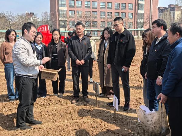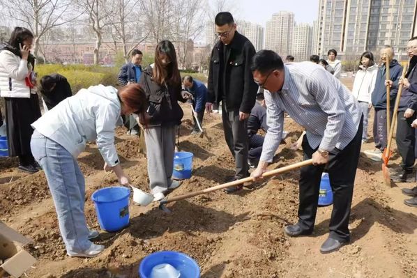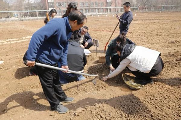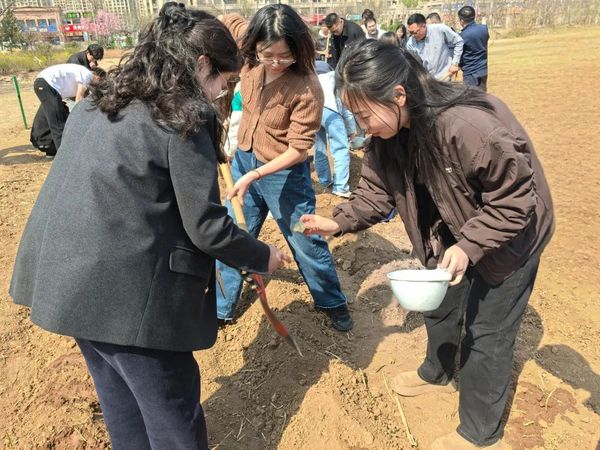 ??支部共建下農(nóng)田,黨群連心種希望。在柏一星書記的帶領(lǐng)下,大家按照翻土-起壟-播種-覆土-澆灌的標準化流程開展勞作。系部負責(zé)開展學(xué)生勞動教育工作的王宇老師,現(xiàn)場示范馬鈴薯種植技術(shù)要點,黨員教師發(fā)揮專業(yè)特長指導(dǎo)株距控制、種植深淺等關(guān)鍵環(huán)節(jié)。師生分工協(xié)作,有的揮鋤翻土,有的彎腰播種,有的提桶澆灌,在勞動中感悟“一粥一飯當思來之不易”的真諦。經(jīng)過近兩個小時的集體勞作,近200平的責(zé)任田全部完成播種,為校園增添了一抹新綠,也深切體悟了作為勞動者的辛勞與欣慰。