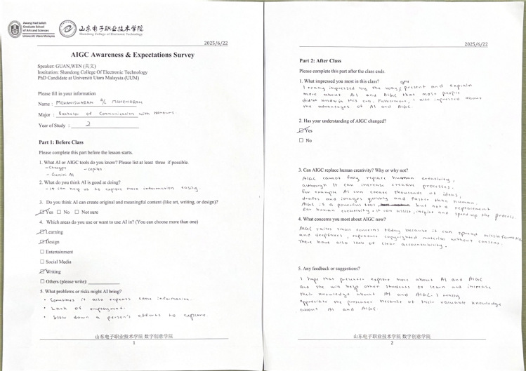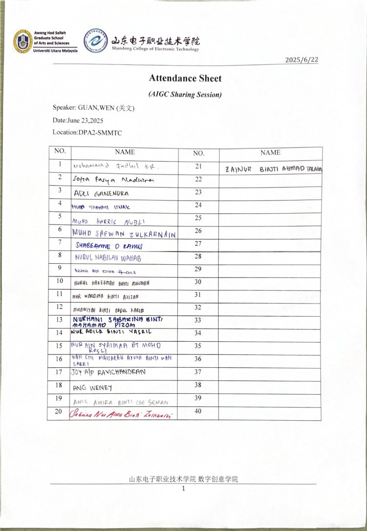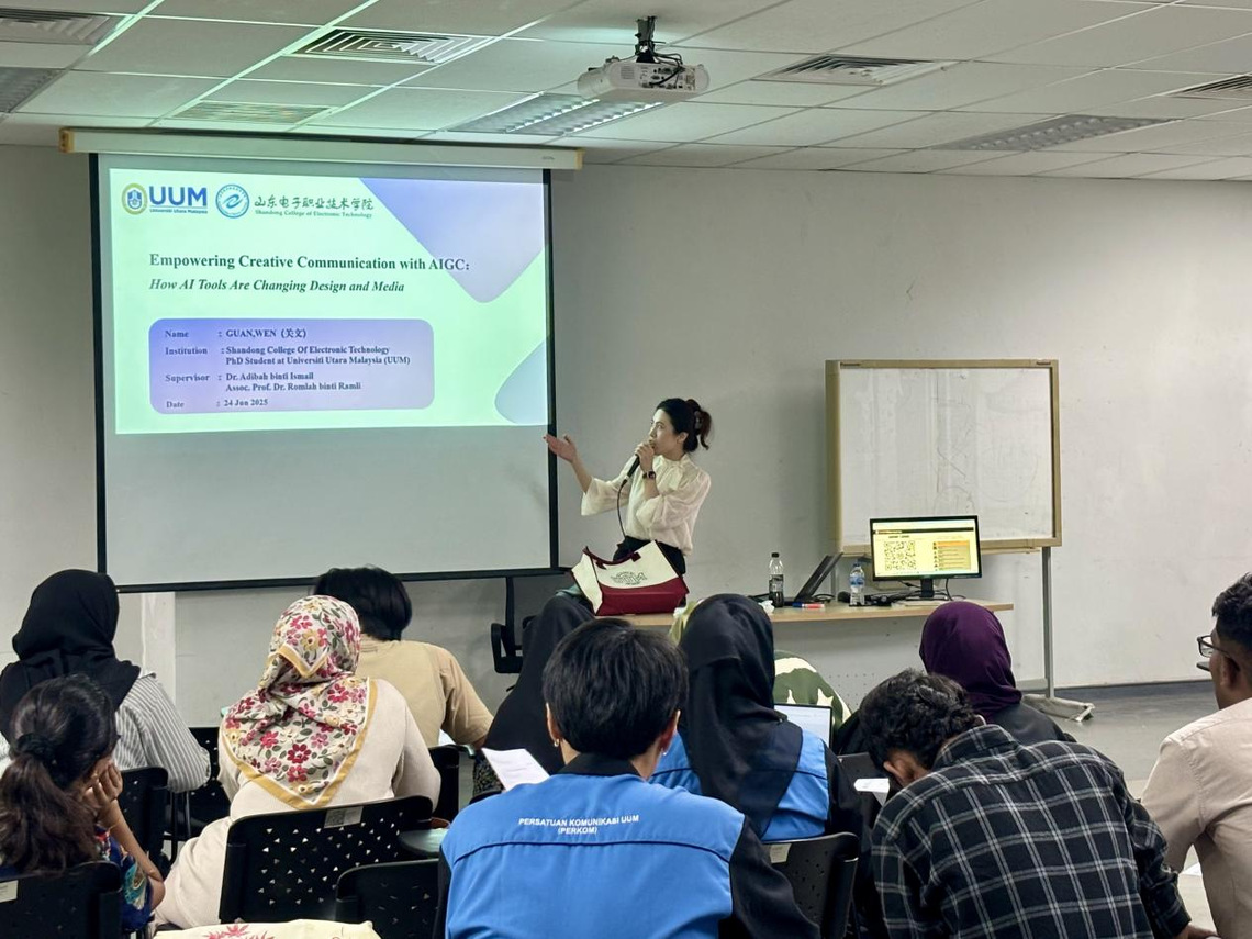 為積極響應“職業(yè)教育出海”戰(zhàn)略,推動人工智能與數(shù)字創(chuàng)意領域的國際交流合作,6月23日,山東電子職業(yè)技術(shù)學院數(shù)字創(chuàng)意學院教師關(guān)文,受邀在馬來西亞北方大學(Universiti Utara Malaysia,簡稱UUM)為傳播學三年級本科生開展了一場主題為《Empowering Creative Communication with AIGC》的實訓型課程分享與技能培訓活動。