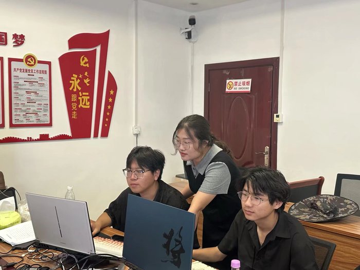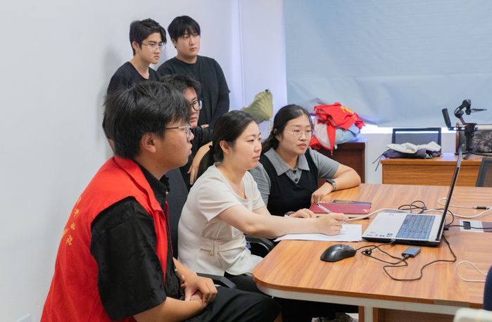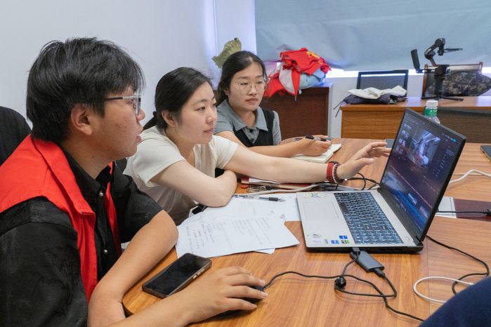 在宣傳影片檢查修改環(huán)節(jié)。朱騰斐和程新宇與服務(wù)隊成員圍坐一起,逐幀審閱影片素材。針對光效轉(zhuǎn)場、產(chǎn)業(yè)片段剪輯