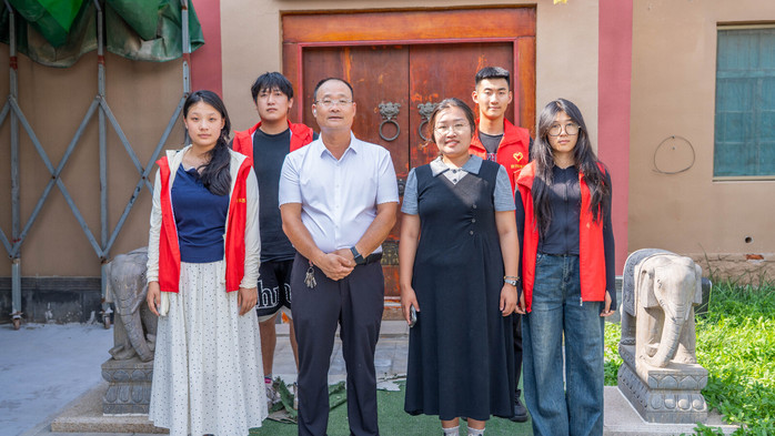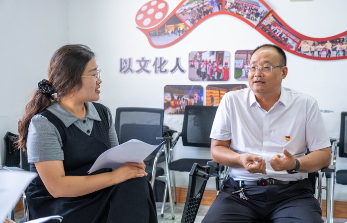 在楊樓村村委會,村支書楊學(xué)偉與指導(dǎo)老師程新宇及服務(wù)隊成員,就當(dāng)?shù)夭宛^經(jīng)營、文化活動開展及特色推廣等議題深入研討。