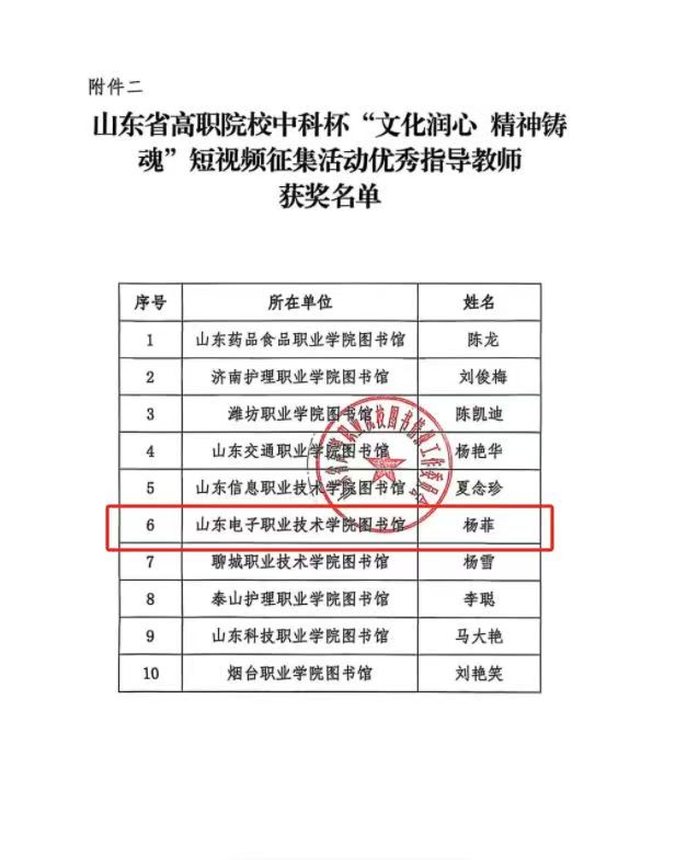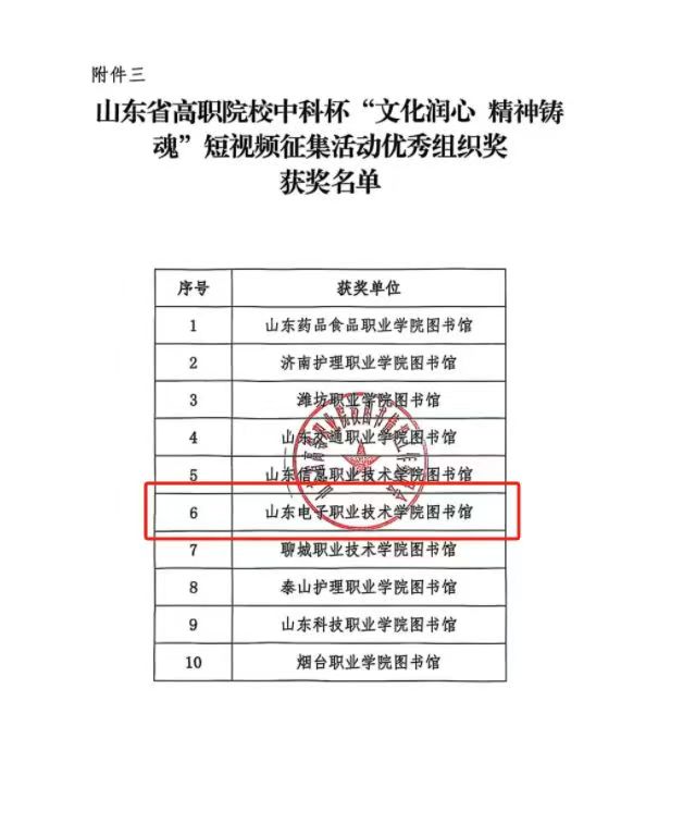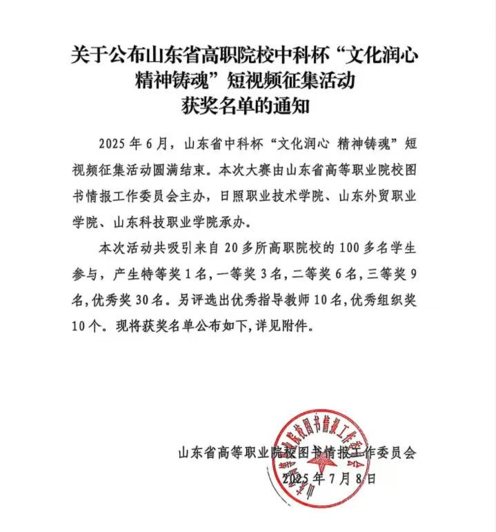 近日,由山東省高等職業(yè)院校圖書(shū)情報(bào)工作委員會(huì)主辦的2025年中科杯“文化潤(rùn)心 精神鑄魂”短視頻征集活動(dòng)圓滿結(jié)束。我校在本次活動(dòng)中表現(xiàn)突出,獲得多項(xiàng)榮譽(yù)。