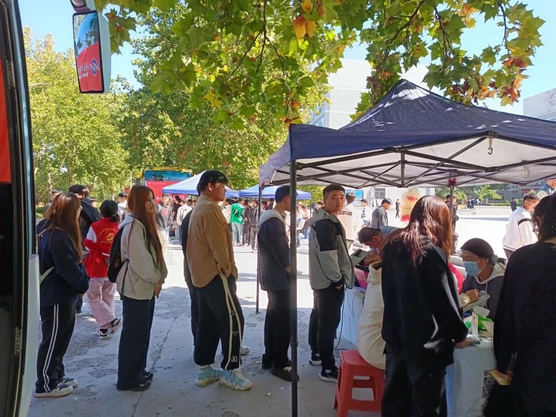圖片為參與獻(xiàn)血的學(xué)生在獻(xiàn)血車前完成報(bào)名信息登記、血壓檢測(cè)等流程