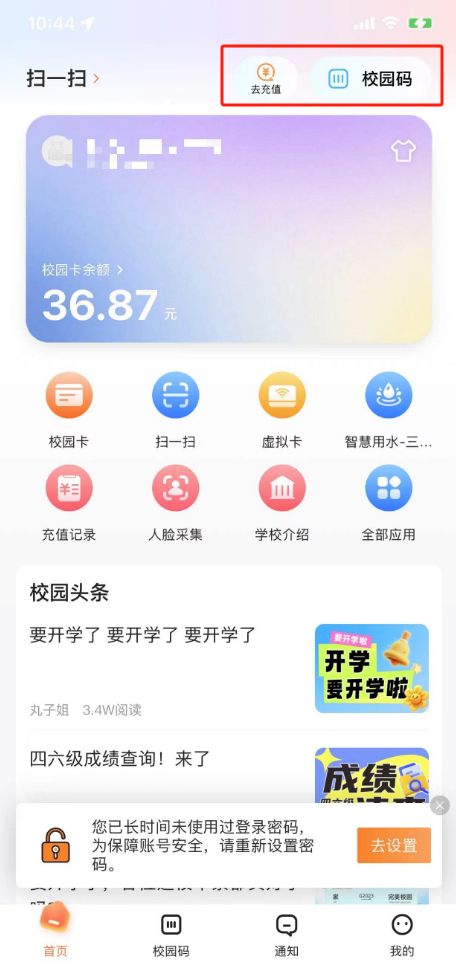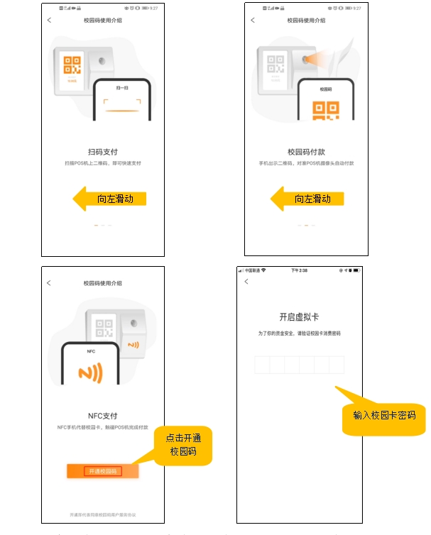 2.首次使用,會進入介紹頁面,向左滑動,直至出現(xiàn)“開通校園碼”按鈕,點擊開通,按提示輸入消費密碼;