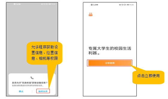 2.安裝完成后打開“完美校園”APP進行注冊,APP會請求獲取網(wǎng)絡狀態(tài)、位置信息、等權(quán)限,請點擊“允許”;