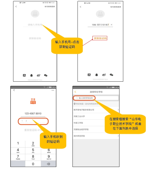 3.填寫手機號獲取驗證碼注冊使用,根據(jù)定位選擇自己所在的學校或者手動輸入學校名字;