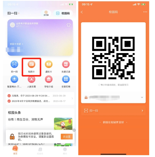 2.刷虛擬卡,也就是校園一卡通二維碼需點擊屏幕右側(cè)按鈕,然后將二維碼對準屏幕框體內(nèi)完成識別認證(注意:在強光狀態(tài)下受限于設備,可能會出現(xiàn)難以識別二維碼的情況,建議此時采取其他方式進出)。