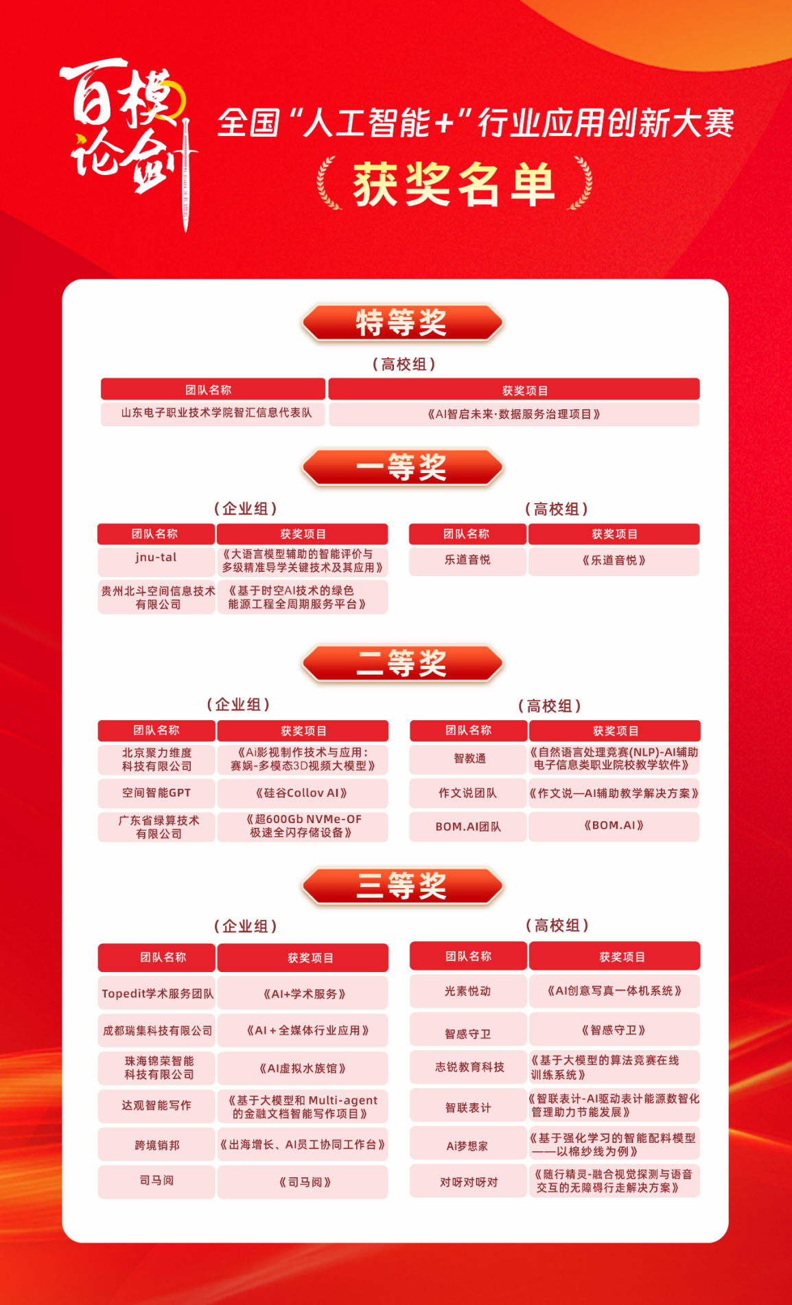 11月20日,由中國電子信息行業(yè)聯(lián)合會(huì)指導(dǎo),中國電子信息行業(yè)聯(lián)合會(huì)數(shù)字經(jīng)濟(jì)專委會(huì)、成都市經(jīng)濟(jì)和信息化局成都市新經(jīng)濟(jì)發(fā)展委員會(huì)主辦的百模論劍·首屆全國“人工智能+”行業(yè)應(yīng)用創(chuàng)新大賽在成都收官,我校網(wǎng)絡(luò)信息中心團(tuán)隊(duì)的《AI智啟未來·數(shù)據(jù)服務(wù)治理項(xiàng)目》獲高校組特等獎(jiǎng),教務(wù)處團(tuán)隊(duì)的《自然語言處理競賽(NLP)——AI輔助電子信息類職業(yè)院校教學(xué)軟件》獲高校組二等獎(jiǎng)。