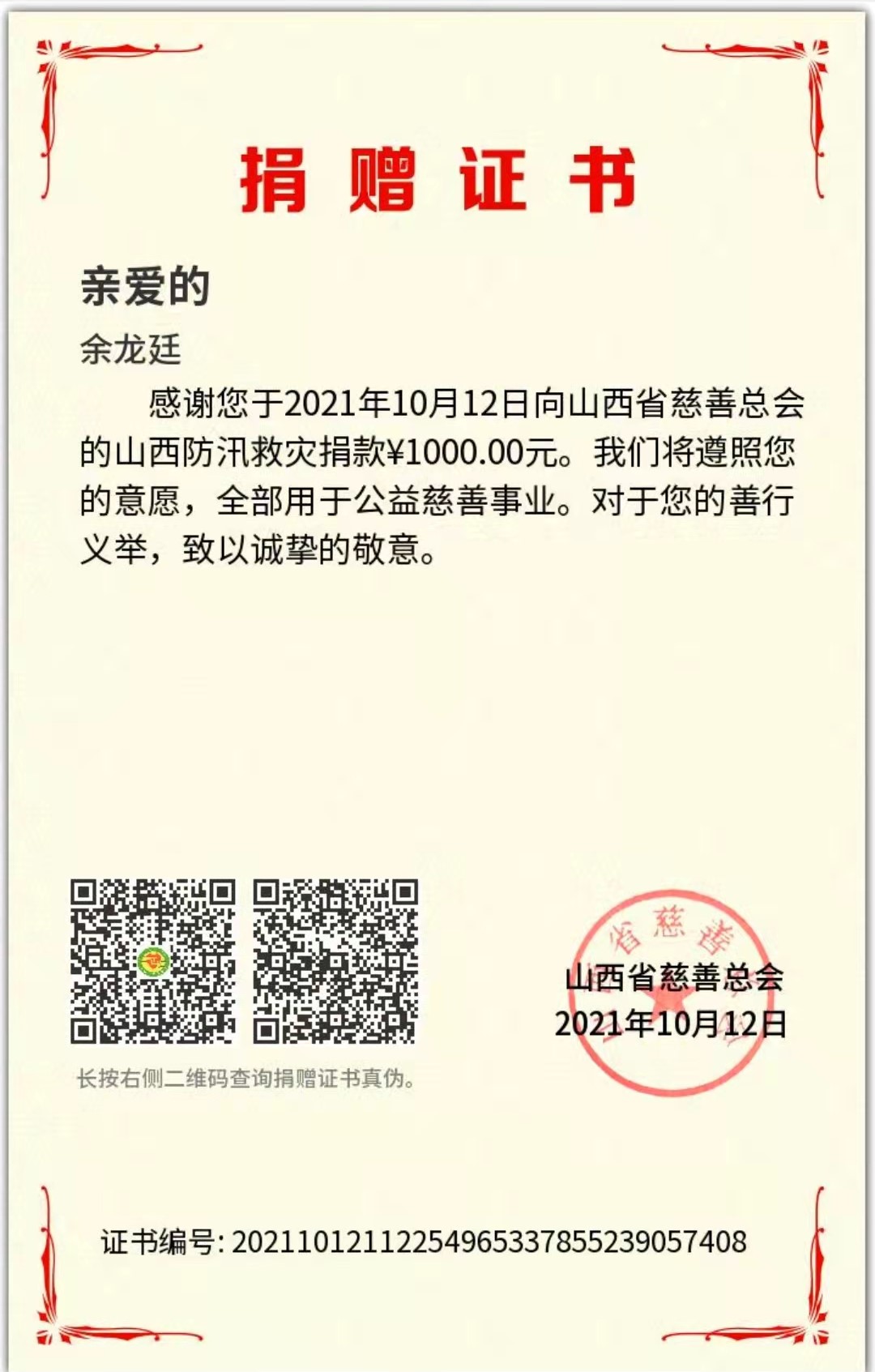 用愛心傳遞愛心,用善舉托舉希望。災(zāi)情當(dāng)前,共克時(shí)艱。余龍廷老師表示,為家鄉(xiāng)獻(xiàn)出一點(diǎn)綿薄之力是自己必須要做的,同時(shí)向所有馳援一線的救災(zāi)官兵及救援機(jī)構(gòu)致敬。山西加油!我們共渡難關(guān)!(宣傳統(tǒng)戰(zhàn)部 高松)