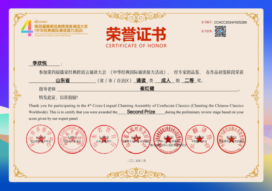 近日,由尼山世界儒學(xué)中心、中國孔子基金會、山東省教育廳等聯(lián)合主辦的第四屆儒家經(jīng)典跨語言誦讀大會落下帷幕。經(jīng)基礎(chǔ)教學(xué)部選拔的作品——中英雙語誦讀節(jié)目《大學(xué)》在此次大會(中華經(jīng)典國際誦讀接力活動)中斬獲山東省二等獎以及全國三等獎的優(yōu)異成績,獲獎?wù)邤?shù)字財經(jīng)系2024級李欣悅、孫璦等七人同時獲得主辦方頒發(fā)的“儒家經(jīng)典傳習(xí)人”榮譽(yù)稱號,為學(xué)校贏得了榮譽(yù)。