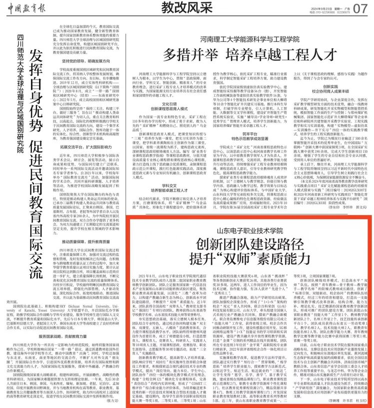 一直以來,山東電子職業(yè)技術(shù)學(xué)院堅持以習(xí)近平新時代中國特色社會主義思想為指導(dǎo),牢牢把握正確的輿論導(dǎo)向和價值導(dǎo)向,弘揚(yáng)主旋律、傳遞正能量,講好山電故事。在中國教育報、中國青年報、大眾日報、聯(lián)合日報、齊魯晚報,山東臺、山東教育電視臺,學(xué)習(xí)強(qiáng)國,中國城市網(wǎng)、央廣網(wǎng)、大眾日報(新媒體)、大眾網(wǎng)、新浪網(wǎng)、中國教育在線、閃電新聞、山東教育發(fā)布等各級各類媒體年度刊發(fā)報道千余篇。2024年5月,在中國教育在線公布的“新媒體運(yùn)營計劃專科/高職院校微信公眾號影響力排行榜”中,我校入圍全國前50名。