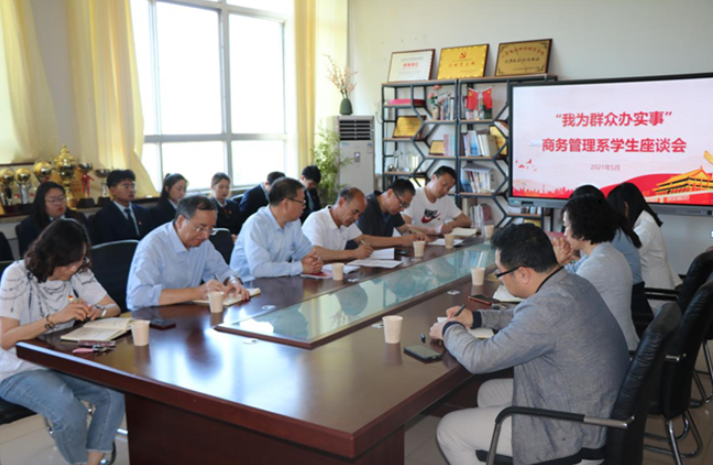為深入推進(jìn)黨史學(xué)習(xí)教育,把黨史學(xué)習(xí)教育與為學(xué)生辦實(shí)事、解難事緊密結(jié)合,5月28日上午,院長(zhǎng)張訓(xùn)華帶領(lǐng)學(xué)院質(zhì)量管理處、財(cái)務(wù)審計(jì)處、資產(chǎn)管理處相關(guān)領(lǐng)導(dǎo)深入商務(wù)管理系調(diào)研,參加商務(wù)管理系“我為群眾辦實(shí)事”學(xué)生座談會(huì)。會(huì)議由商務(wù)管理系黨總支書(shū)記李成鋮主持,商務(wù)管理系全體干部、輔導(dǎo)員及各班級(jí)學(xué)生代表參加了本次會(huì)議。