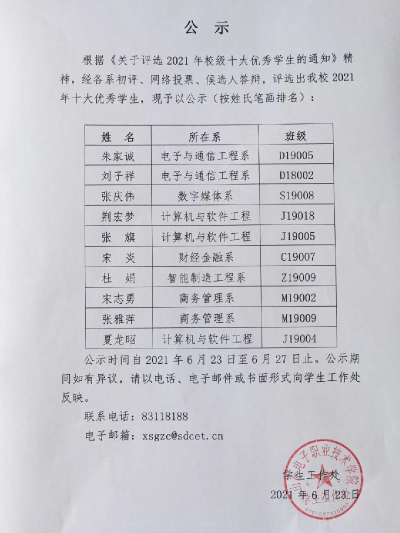 答辯結(jié)束后,評審小組根據(jù)評選網(wǎng)絡(luò)投票和現(xiàn)場答辯的綜合成績評選出2021年十大優(yōu)秀學(xué)生,公示如下:(學(xué)生工作處 楊菲)