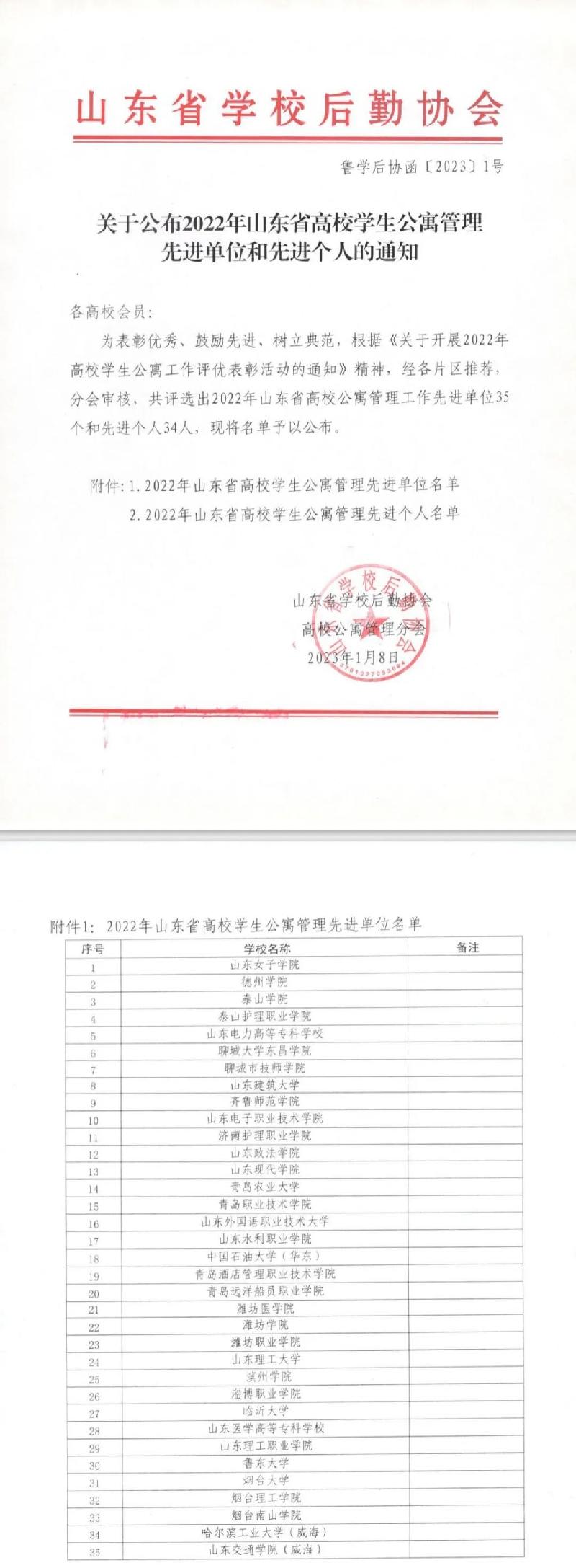 近日,2022年山東省高校學(xué)生公寓管理先進單位和先進個人名單公布,我校連續(xù)第四年獲得山東省高校學(xué)生公寓管理先進單位稱號。