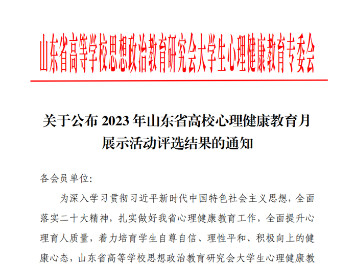 為深入學(xué)習(xí)貫徹習(xí)近平新時(shí)代中國(guó)特色社會(huì)主義思想,全面落實(shí)黨的二十大精神,扎實(shí)做好心理健康教育工作,全面提升心理育人質(zhì)量,著力培育學(xué)生自尊自信、理性平和、積極向上的健康心態(tài),山東省高等學(xué)校思想政治教育研究會(huì)大學(xué)生心理健康教育專業(yè)委員會(huì)舉辦了2023年山東省高校心理健康教育月展示活動(dòng)。