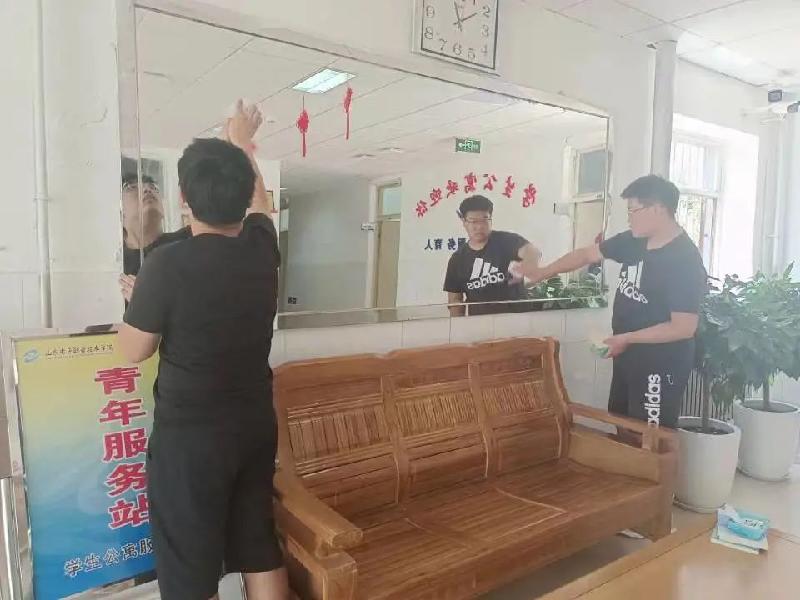 首先,公寓開展了志愿勞動活動。學生公寓服務中心的同學們端起水盆,拿起抹布,對二號樓大廳的榮譽墻和海報架進行了擦拭,對大廳衣容鏡進行了清潔,并對樓梯拐角處的窗戶和窗臺進行了認真擦拭,使其面貌煥然一新。部分同學還走進學生宿舍,主動幫在宿同學打掃衛(wèi)生,擦拭風扇,受到受訪同學們的熱情歡迎與好評。