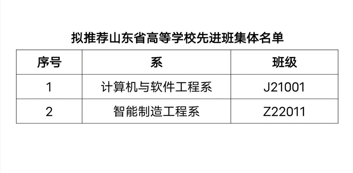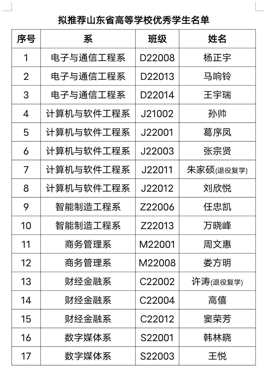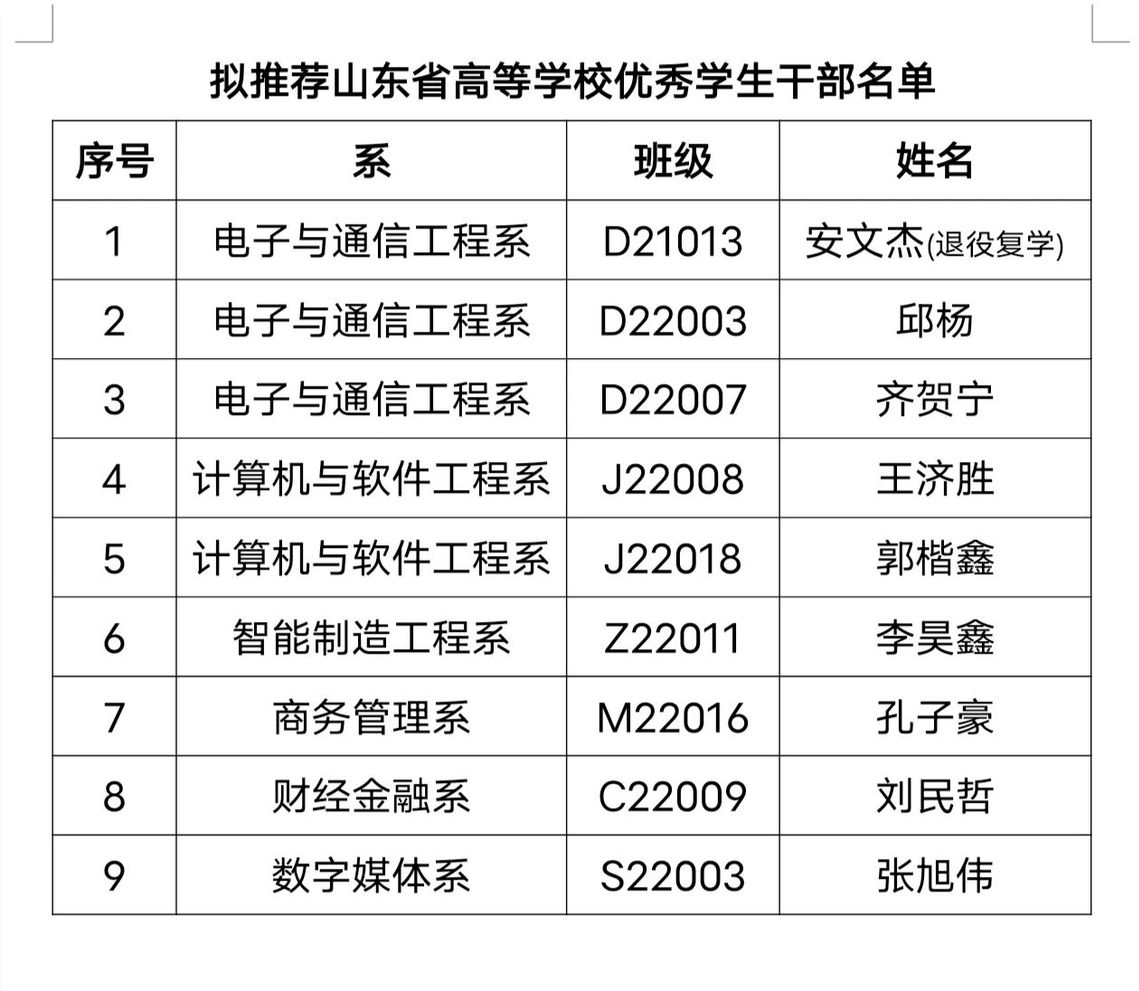 根據(jù)《山東省教育廳關(guān)于評(píng)選高等學(xué)校優(yōu)秀學(xué)生、優(yōu)秀學(xué)生干部和先進(jìn)班集體的通知》(魯教學(xué)函〔2024〕8號(hào))要求,學(xué)校組織開展了2023年度山東省高等學(xué)校優(yōu)秀學(xué)生、優(yōu)秀學(xué)生干部和先進(jìn)班集體評(píng)選工作。經(jīng)各系初評(píng)推薦、學(xué)校復(fù)核評(píng)審等環(huán)節(jié),現(xiàn)將擬推薦學(xué)生(集體)名單予以公示,接受廣大師生的監(jiān)督,如有異議,請(qǐng)向?qū)W生工作處反映。