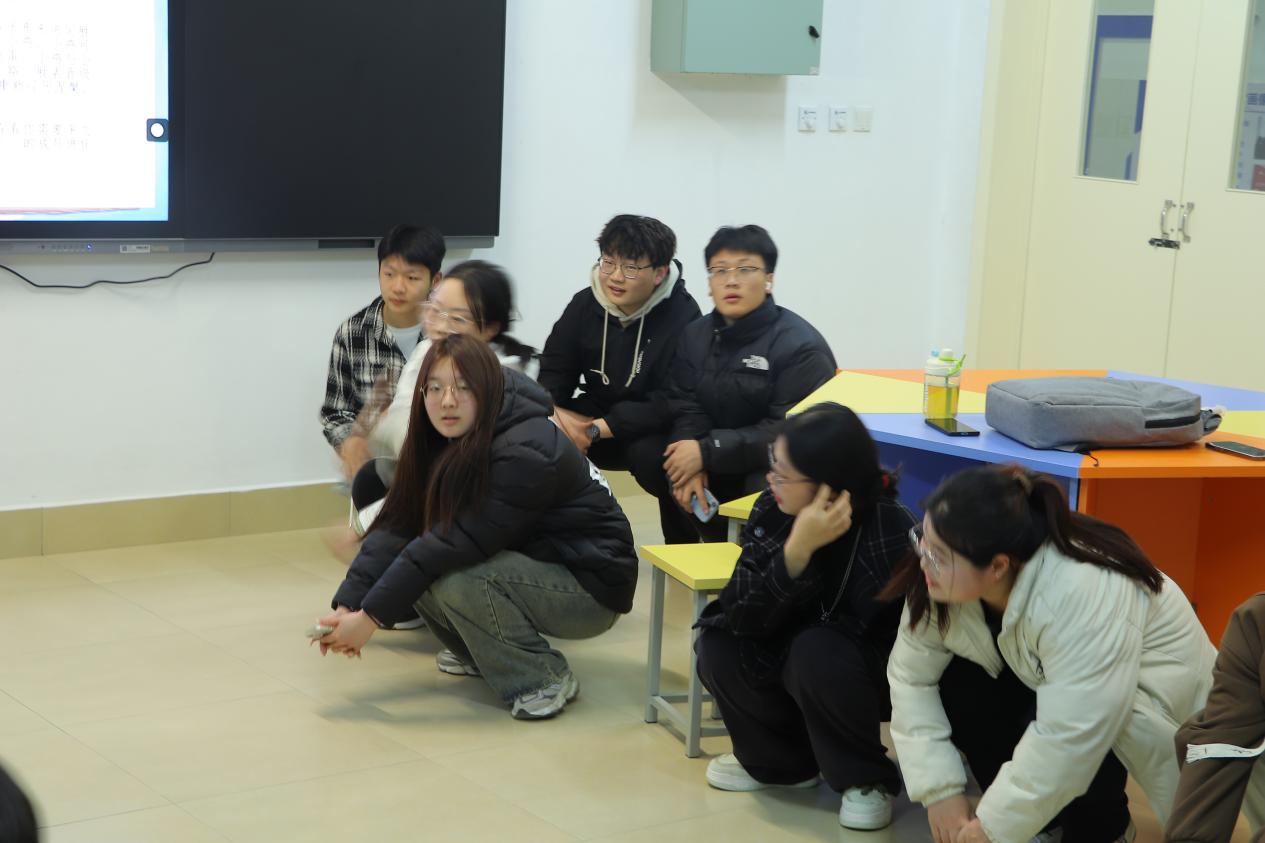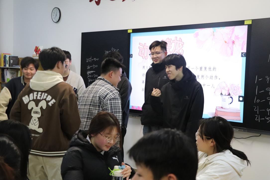 第四個環(huán)節(jié)——“動作接龍”,一個人先做動作,另一個重復(fù)他的動作,并加上新的動作,重復(fù)如此,訓(xùn)練個人的靈敏度和團隊合作精神,放松身心。