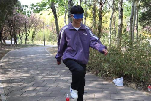 第二個環(huán)節(jié)——蒙眼原地踏步走,挑戰(zhàn)者在規(guī)定范圍內(nèi)蒙眼原地踏步走,規(guī)定時間內(nèi)不走出范圍即為獲勝,通過這個游戲,提高了同學(xué)們的專注力,鍛煉了同學(xué)們的平衡感知能力,培養(yǎng)了同學(xué)們積極挑戰(zhàn)的勇氣。