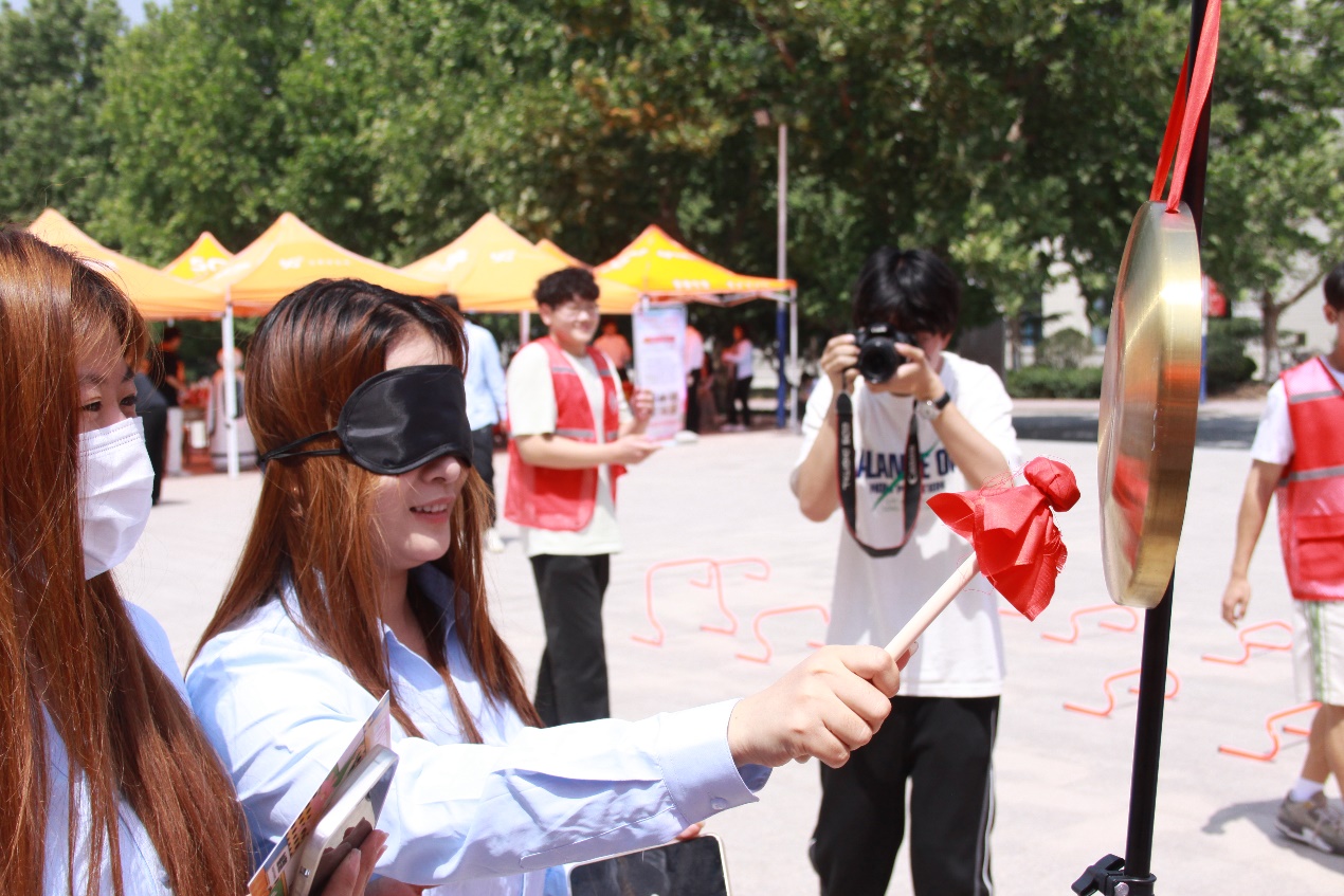 蒙眼敲鑼:同學(xué)們的歡笑聲,貫耳的捅鑼聲,這些美妙的“音符”譜出了一支熱烈的夏日狂想曲。