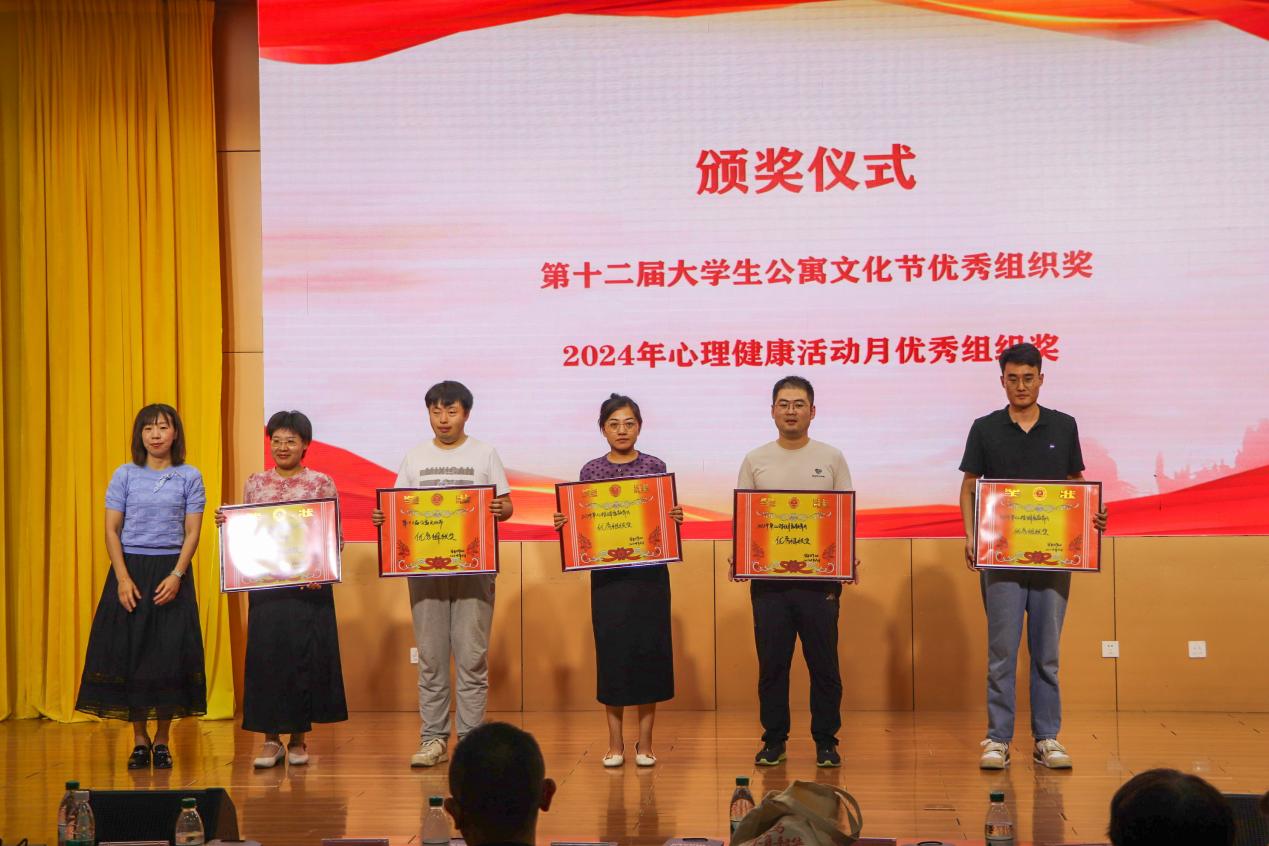 學生工作處負責人宣讀第十二屆公寓文化節(jié)和心理健康教育月活動表彰決定并講話。典禮中展示了第十二屆公寓文化節(jié)和心理健康教育月系列活動的豐碩成果,對評選出的活動單項獎、優(yōu)秀指導教師和優(yōu)秀組織獎等先進個人和集體,進行現(xiàn)場頒獎。