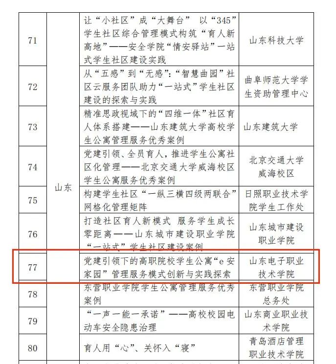 在本次評選活動中,山東省共有10所高校獲此殊榮,相關(guān)案例將被編入《全國高校學生公寓管理服務(wù)典型案例匯編》中,并通過中國教育后勤協(xié)會官網(wǎng)、公眾號以及“高校學生公寓管理”公眾號等官方平臺進行宣傳和推廣。