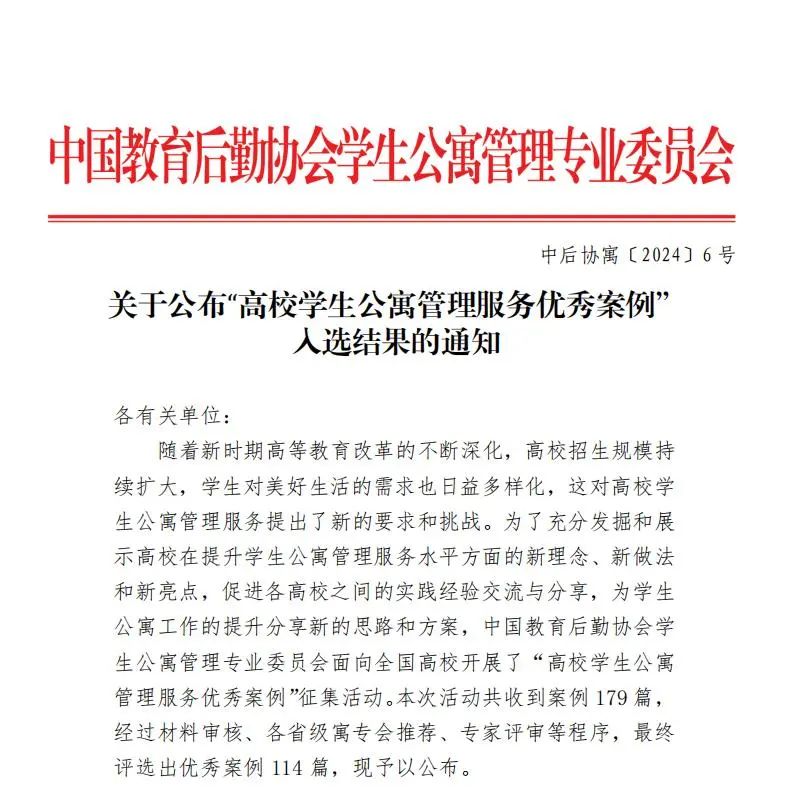 近日,中國教育后勤協(xié)會公布了“高校學生公寓管理服務(wù)優(yōu)秀案例”評選結(jié)果,我校學生工作處依托學校“一站式”學生社區(qū)建設(shè)撰寫的《黨建引領(lǐng)下的高職院校學生公寓“e安家園”管理服務(wù)模式創(chuàng)新與實踐探索》案例成功入選。