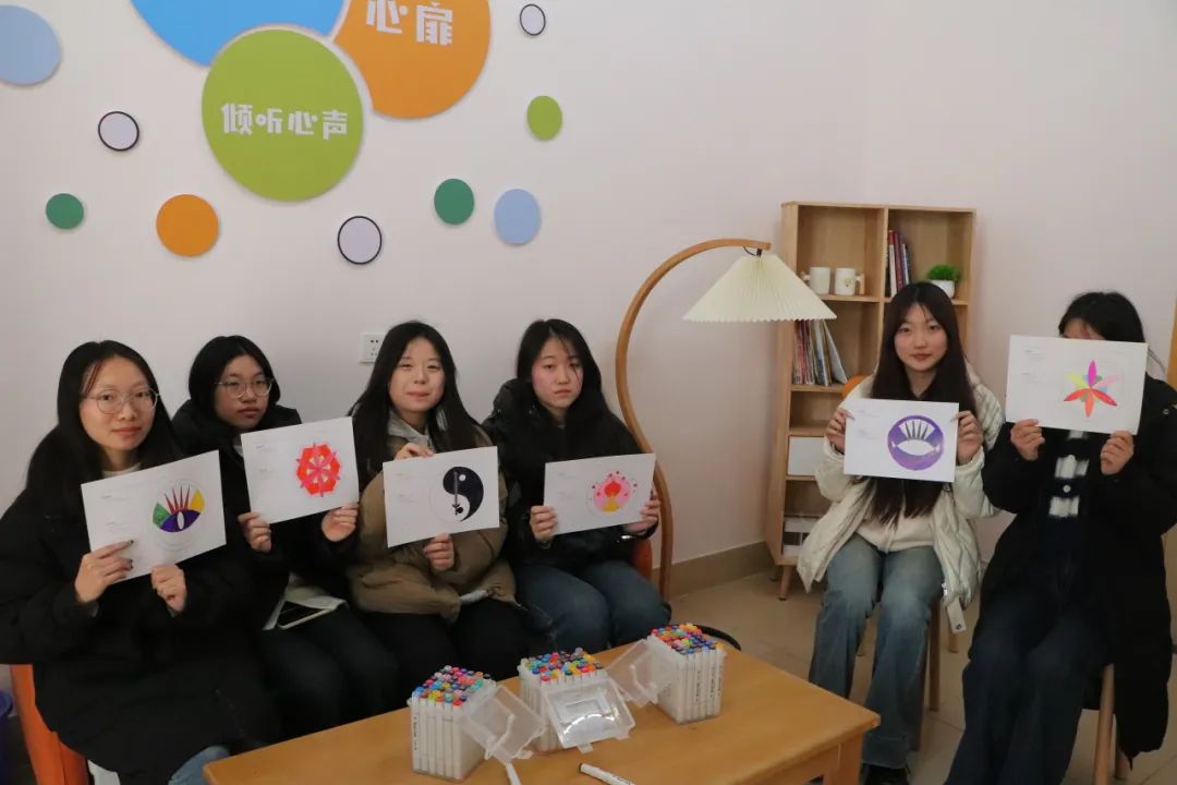 最后的曼陀羅繪畫環(huán)節(jié)將活動推向高潮。同學(xué)們用抽象線條與色塊肆意表達(dá)當(dāng)下心境,讓平時那些容易被忽視的情緒得到了釋放,減輕了情緒負(fù)擔(dān)。