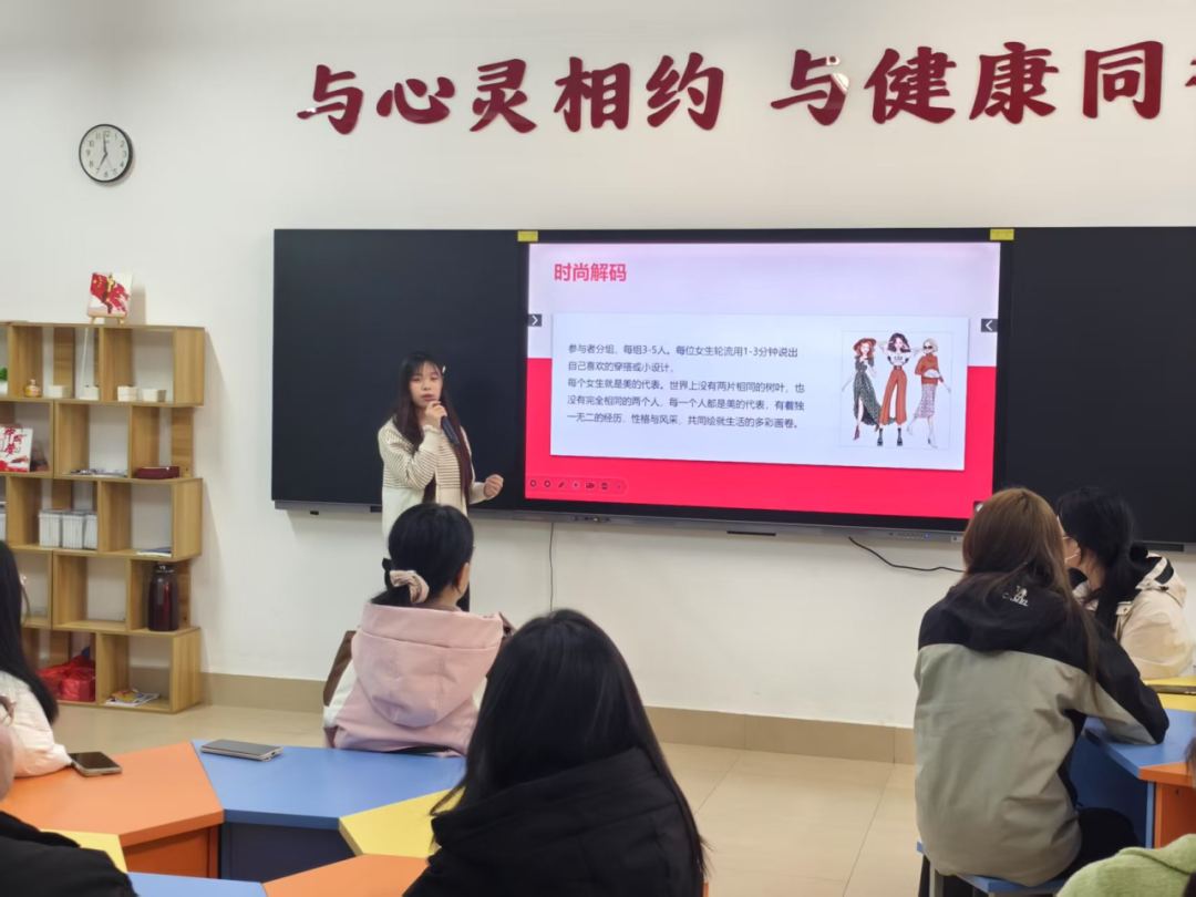 在舒緩的音樂中,進(jìn)行了熱身活動(dòng)“時(shí)尚解碼”,通過分享個(gè)人的時(shí)尚穿搭,拉進(jìn)了同學(xué)們之間的距離,幫助同學(xué)們放松身心。