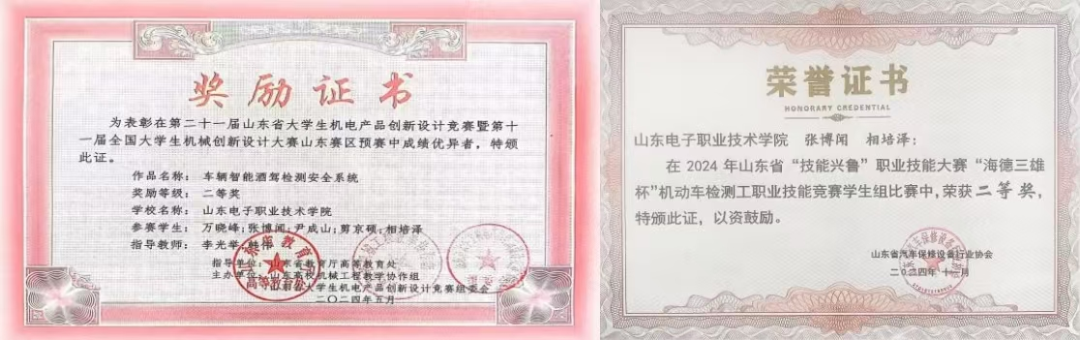 “1412”團(tuán)隊(duì)的努力與創(chuàng)新在賽場上得到了充分驗(yàn)證。2024年,團(tuán)隊(duì)在各類競賽中成績斐然。5月,張博聞等人研發(fā)的“車輛智能酒駕檢測安全系統(tǒng)”榮獲山東省大學(xué)生機(jī)電產(chǎn)品創(chuàng)新設(shè)計(jì)競賽二等獎;11月,團(tuán)隊(duì)雙線告捷,李振等人的新材料研究項(xiàng)目斬獲全國職業(yè)院校“發(fā)明杯”創(chuàng)新創(chuàng)業(yè)大賽金獎,張博聞、相培澤在“技能興魯”機(jī)動車檢測工大賽中獲獎。