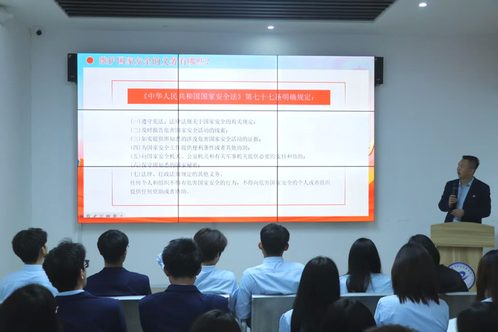 活動中,學生工作處李友老師以“新時代大學生與國家安全”為主題展開專題講解。他系統(tǒng)闡釋了國家安全的豐富內(nèi)涵與涵蓋的16個重點領域,深入解讀總體國家安全觀的“十個堅持”,并借助近年來高校學生群體中發(fā)生的真實案例,生動剖析境外勢力滲透、網(wǎng)絡數(shù)據(jù)竊取、軍事裝備泄密等危害國家安全行為的隱蔽性。李友老師特別強調(diào),當代大學生應主動提升政治敏感性和安全防范意識,在涉外交流、網(wǎng)絡社交、日常生活等場景中嚴守底線,做到“警惕風險、明辨是非、理性發(fā)聲”,將維護國家安全融入日常生活的點滴行動。