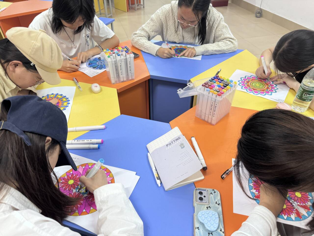 在6304團(tuán)輔活動室開展的“曼陀羅繪畫”活動,輔導(dǎo)員程新宇帶領(lǐng)學(xué)生體驗這一兼具放松與療愈功能的藝術(shù)形式。參與者通過自由揮動畫筆,將潛意識中的情感與思緒轉(zhuǎn)化為具象的色彩構(gòu)圖。活動現(xiàn)場,同學(xué)們專注于線條與色塊的組合,在創(chuàng)作過程中完成壓力釋放與自我探索。