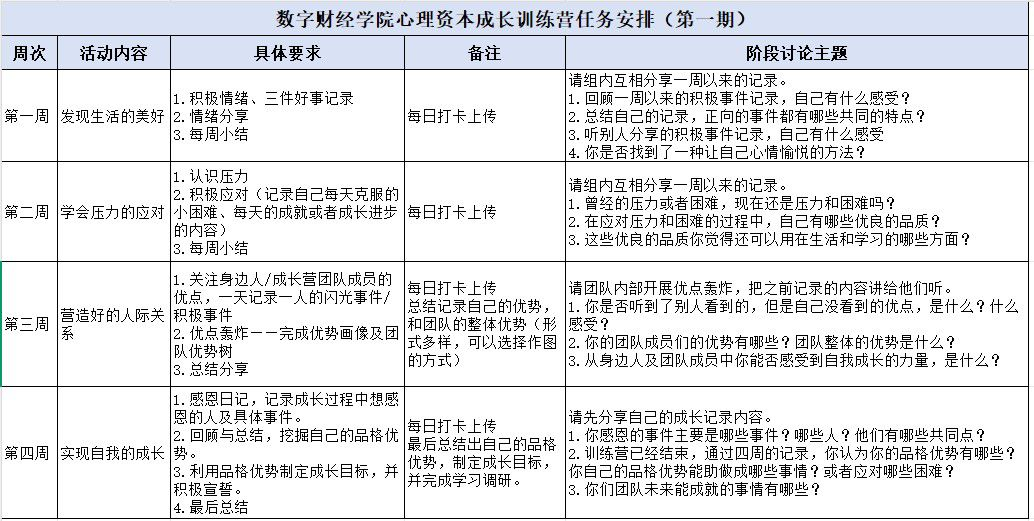 訓(xùn)練營以“發(fā)現(xiàn)生活的美好——學(xué)會(huì)壓力的應(yīng)對(duì)——營造和諧人際關(guān)系——實(shí)現(xiàn)自我成長突破”為主線,創(chuàng)新四大模塊,打破傳統(tǒng)局限,采用“個(gè)人探索+團(tuán)隊(duì)協(xié)作”雙線模式,引導(dǎo)學(xué)生認(rèn)知重塑與行為轉(zhuǎn)化。