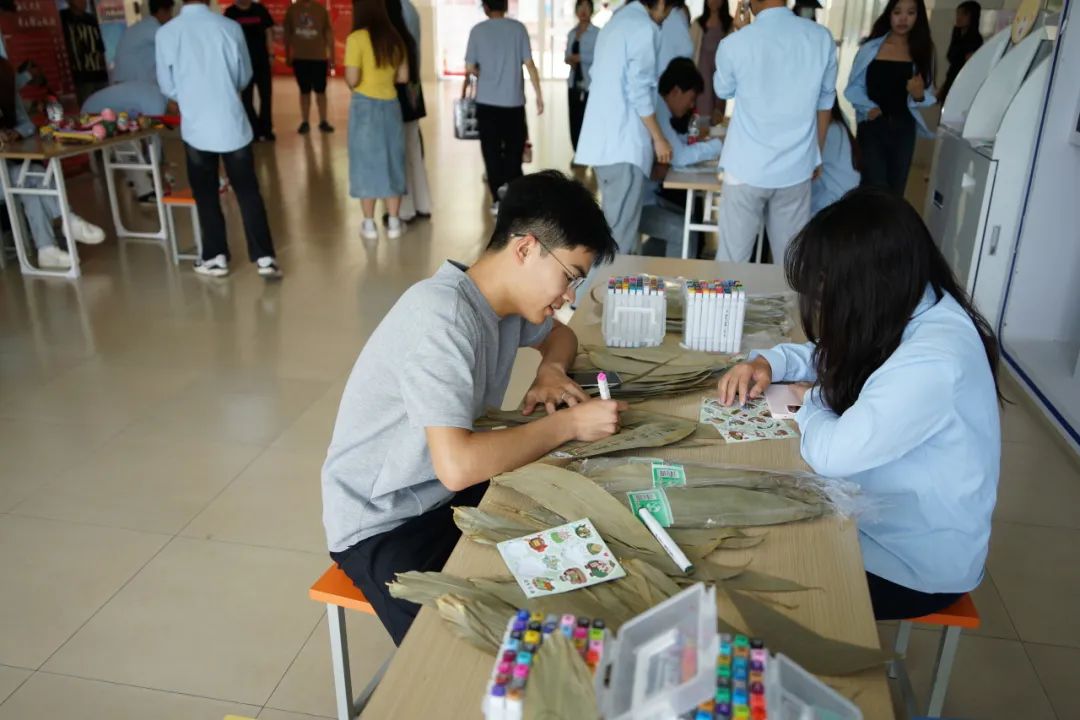 “不效艾符趨習(xí)俗,但祈蒲酒話升平。”在“書粽同源”區(qū),粽葉化作詩意載體。同學(xué)們揮毫潑墨,將端午詩詞、美好祝愿凝于粽葉之上,制成獨(dú)特書簽,讓傳統(tǒng)文化躍然指尖。