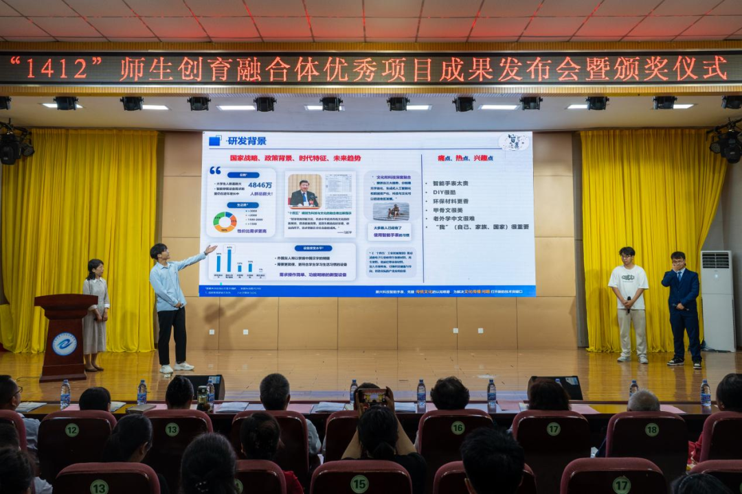 活動在一段回顧師生奮斗歷程的快閃視頻中拉開帷幕,生動呈現了從實驗室深夜攻關到賽場自信綻放的點點滴滴。教務處處長張欣宣讀了項目評審情況及表彰決定。首輪頒獎環(huán)節(jié),“1412”師生創(chuàng)育融合體“十佳項目作品”團隊代表閃亮登臺,宣傳統(tǒng)戰(zhàn)部部長聶鶯為他們送上這份殊榮。這些屬于探索者與追夢者的榮譽,不僅是技術創(chuàng)新的結晶,更是“師生共創(chuàng)”理念下教學相長、情誼交融的最佳印證。